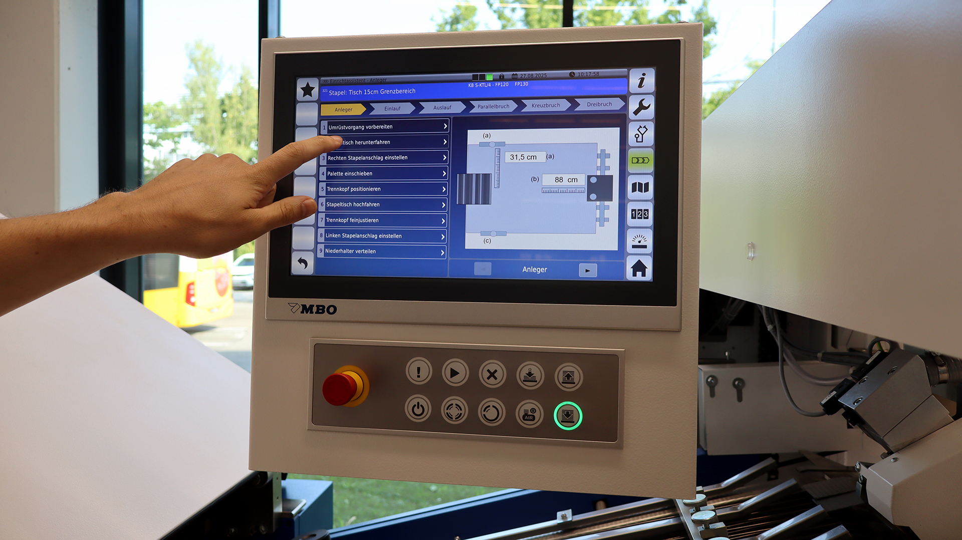 Für jeden Arbeitsablauf hat der Wissenschaftler also eine detaillierte Schritt-für-Schritt-Anleitung abgeleitet. Diese dient als Grundlage für die automatische Erstellung der grafischen Inhalte auf dem Display der Falzmaschine. Mit Pfeilen und schematischen Zeichnungen zeigt sie dem Maschinenbediener, wo er die einzelnen Einstellungen vornehmen kann. Um das Display dementsprechend überarbeiten zu können, hat die Firma MBO Postpress Solutions Hägle Zugriff auf den Quellcode gewährt.