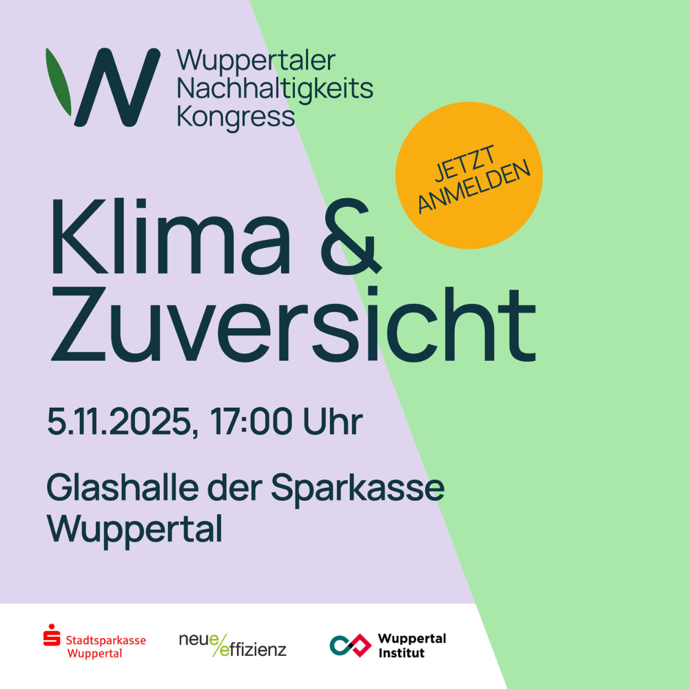 Mit dem Wuppertaler Nachhaltigkeitskongress, dieses Jahr unter dem Motto „Klima und Zuversicht“, setzen das Wuppertal Institut, die Stadtsparkasse Wuppertal und die Neue Effizienz die erfolgreiche Eventreihe fort: Seit 2022 informiert der Nachhaltigkeitskongress die Wuppertaler Stadtgesellschaft und alle anderen Interessierten über aktuelle Entwicklungen in Wissenschaft, Wirtschaft, Politik und Kultur – mit interessanten Formaten, bekannten Speaker*innen und aktuellen Impulsen aus der Wissenschaft.