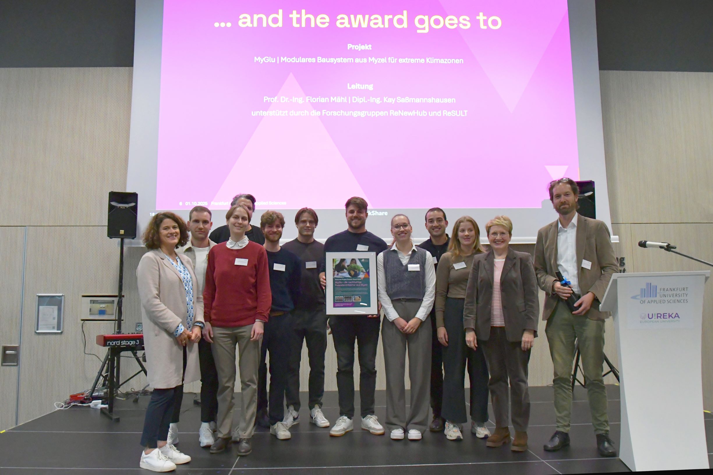 Eine günstige und schützende Behausung für trockene Regionen ganz aus Pilzmyzel – Architektur-Studierende der Frankfurt University of Applied Sciences (Frankfurt UAS) haben im Sommersemester 2025 mit dem „MyGlu“ ein nachhaltiges Baukonzept in Zeiten des Klimawandels erprobt. Das Lehrprojekt von Professor Dr. Florian Mähl, Mitglied des Lehr- und Forschungsnetzwerks ReNewHub am Fachbereich Architektur, Bauingenieurwesen, Geomatik, hat dafür den hochschulweit ausgeschriebenen Sustain Award erhalten. Anfang Oktober 2025 nahm Mähl mit den Studierenden bei einer Gala die Preisurkunde entgegen. Die Auszeichnung ist mit 4.000 Euro dotiert.
