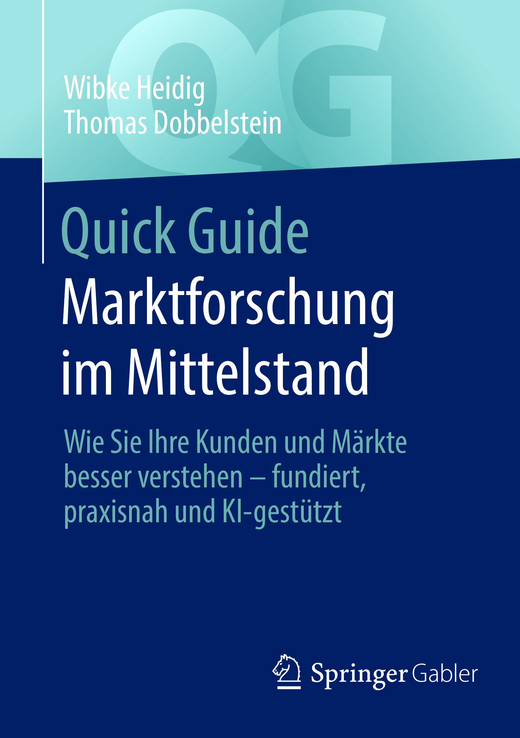 Nach dem großen Erfolg der ersten Auflage des „Quick Guide Marktforschung für den Mittelstand“ mit über 50.000 Downloads ist nun die zweite, vollständig überarbeitete Auflage veröffentlicht worden: „Quick Guide Marktforschung im Mittelstand – Wie Sie Ihre Kunden und Märkte besser verstehen – fundiert, praxisnah und KI-gestützt“. Die Autoren sind Prof. Dr. Wiebke Heidig von der Hochschule Albstadt-Sigmaringen und Prof. Dr. Thomas Dobbelstein, Studiengangsleiter BWL-Digital Business Management an der DHBW Ravensburg. Erschienen ist das Buch im Verlag Springer Gabler.