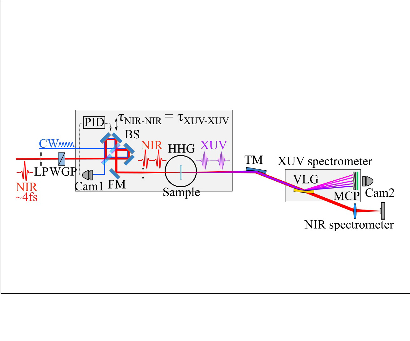 Experimenteller Aufbau zur Erzeugung von phasenstabilisierten NIR und XUV Pulsen mit Hilfe eines aktiv stabilisierten Interferometers.