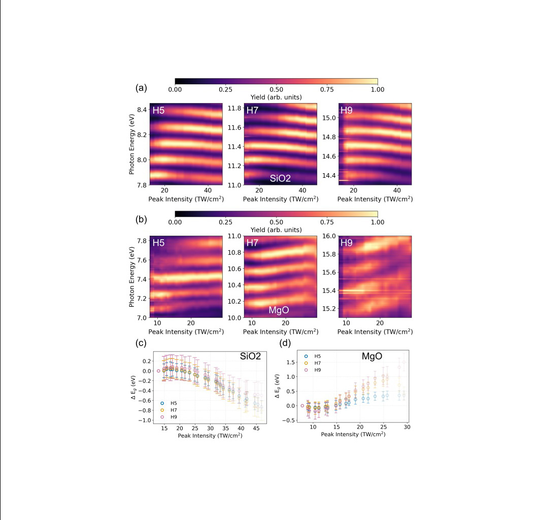 Intensitätsabhängige Phasenverschiebung in den hohen Harmonischen aus SiO₂ (a) und MgO (b). (c) Extrahierte Bandkantenänderung in SiO₂. (d) Analog zu (c) aber für MgO.