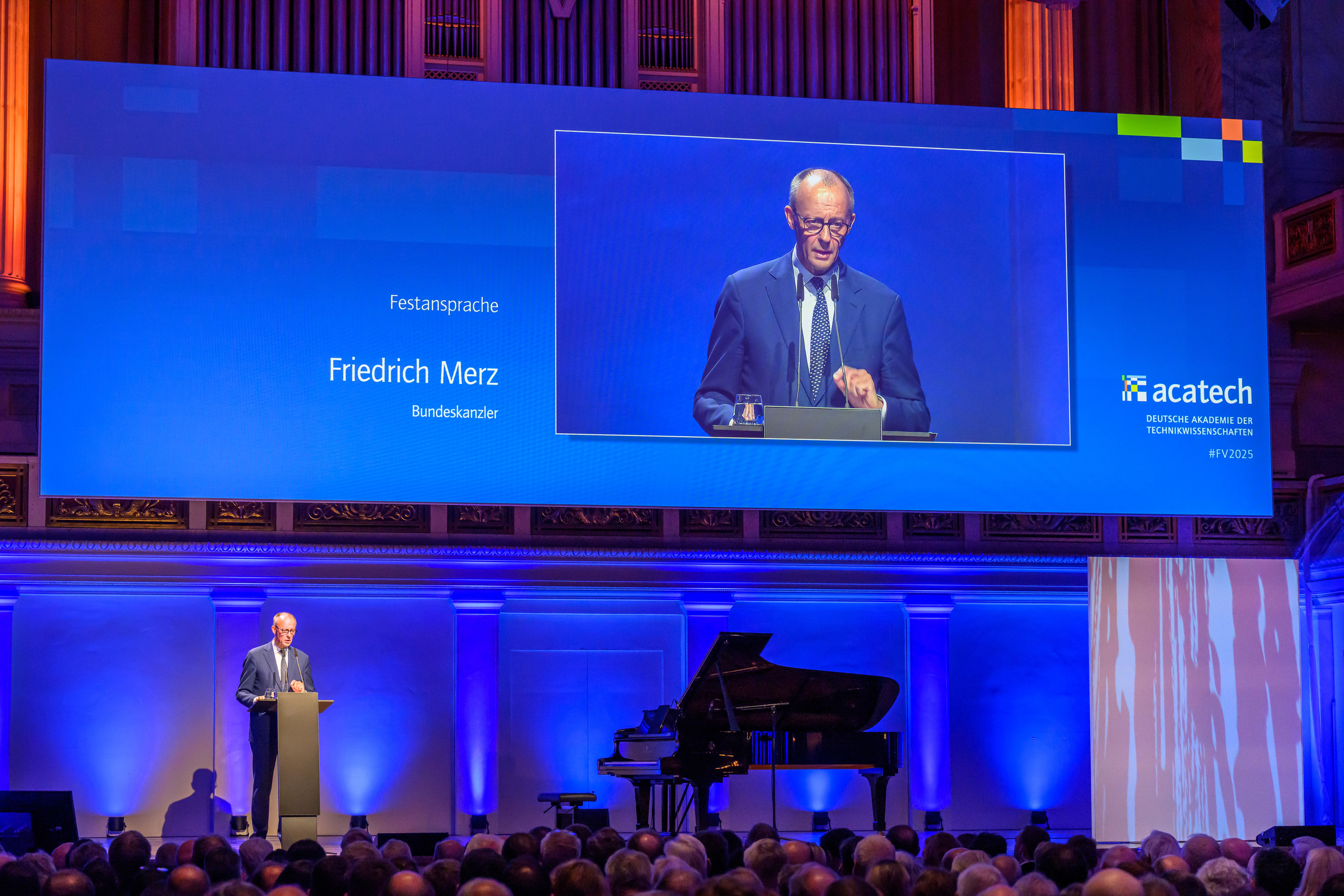 Vor mehr als 500 Gästen aus Wissenschaft, Wirtschaft und Politik unterstrich Bundeskanzler Friedrich Merz im Berliner Konzerthaus die Bedeutung technologischer Innovation: „Zu den großen Stärken Deutschlands und Europas gehört unser Wille und unsere Fähigkeit, den technischen Fortschritt an Zielen auszurichten, die dem Gemeinwohl dienen. Die Deutsche Akademie der Technikwissenschaften ist mit ihrer umfangreichen Arbeit in der überparteilichen, interdisziplinären, branchenübergreifenden Beratung von Politik und Gesellschaft in technologiepolitischen Zukunftsfragen eine Institution für echten Fortschritt in diesem Sinne. Wir brauchen ihre gesammelte Expertise dringender als jemals zuvor. Denn im Bereich der Forschung und Entwicklung wird sich entscheiden, wie die Zukunft unseres Landes und wie die Zukunft Europas aussehen wird: wie frei, wie wohlhabend, wie sicher wir leben werden können.“