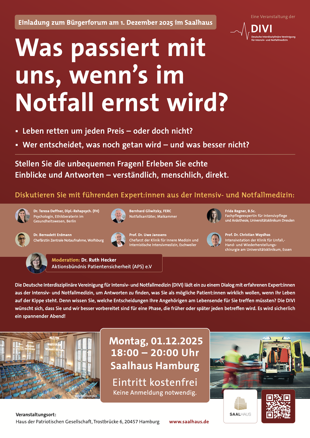 Das Poster zur Veranstaltung hängt bereits in Hamburger Notaufnahmen und auf Intensivstationen in der Hansestadt aus, um betroffene Angehörige auf das Bürgerforum im Dezember aufmerksam zu machen. Nutzen Sie es sehr gerne auch in Ihrem Medium: https://www.divi.de/dokumente-fuer-mitglieder/a2-poster-fuer-das-divi-buergerforum-am-1-dezember-2025/download
