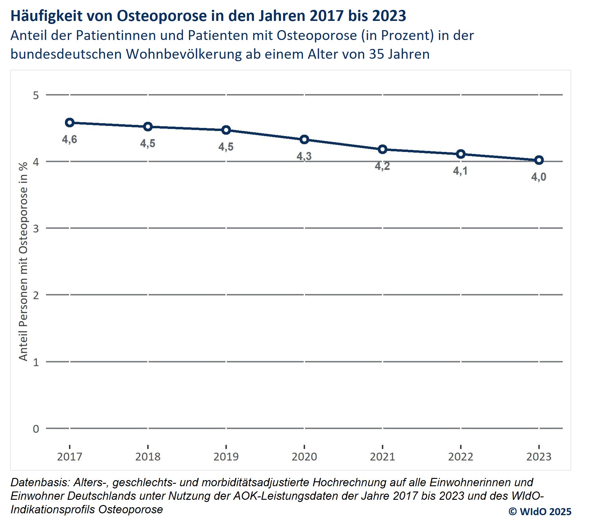 2,15 Millionen Menschen ab 35 Jahren waren im Jahr 2023 von Osteoporose betroffen. Das zeigt der aktuelle „Gesundheitsatlas Deutschland“ des Wissenschaftlichen Instituts der AOK (WIdO). Die meisten Betroffenen waren mit 5,8 Prozent in Sachsen-Anhalt zu verzeichnen, während in Hamburg nur 2,9 Prozent der Bevölkerung die Diagnose Osteoporose erhielten. Die Krankheitshäufigkeit ist laut der Analyse des WIdO in den vergangenen Jahren kontinuierlich gesunken – von 4,6 Prozent im Jahr 2017 auf 4,0 Prozent im Jahr 2023.