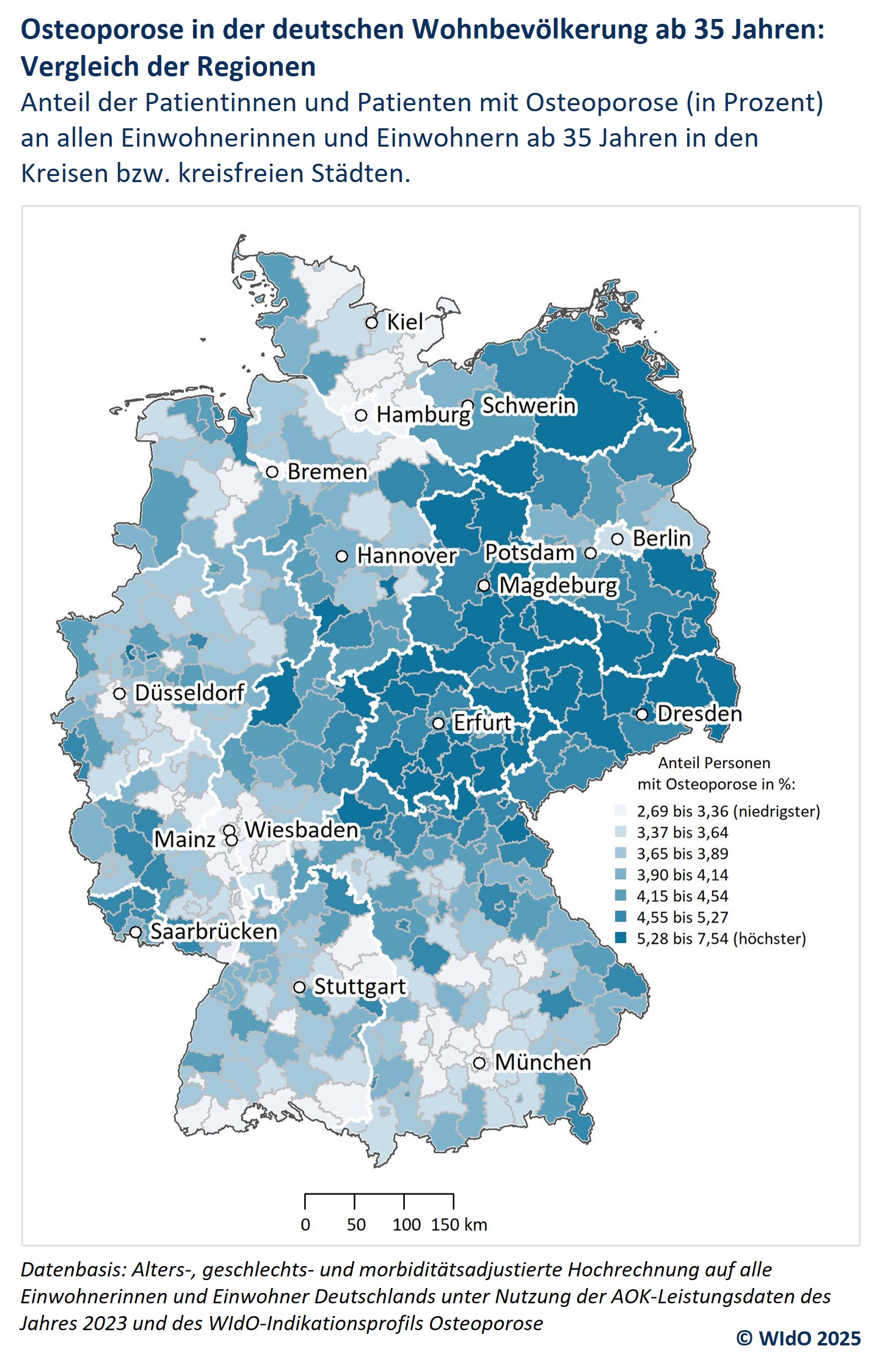 Auf der Ebene der Bundesländer zeigen sich große regionale Unterschiede bei der Häufigkeit von Osteoporose. Nach der Analyse des Gesundheitsatlas Deutschland sind die Einwohnerinnen und Einwohner in Sachsen-Anhalt (5,8 Prozent), Thüringen (5,6 Prozent) und Sachsen (5,4 Prozent) am stärksten betroffen. Am niedrigsten ist die Krankheitshäufigkeit in Hamburg mit 2,9 Prozent, gefolgt von Bremen (3,3 Prozent) und Schleswig-Holstein (3,4 Prozent).