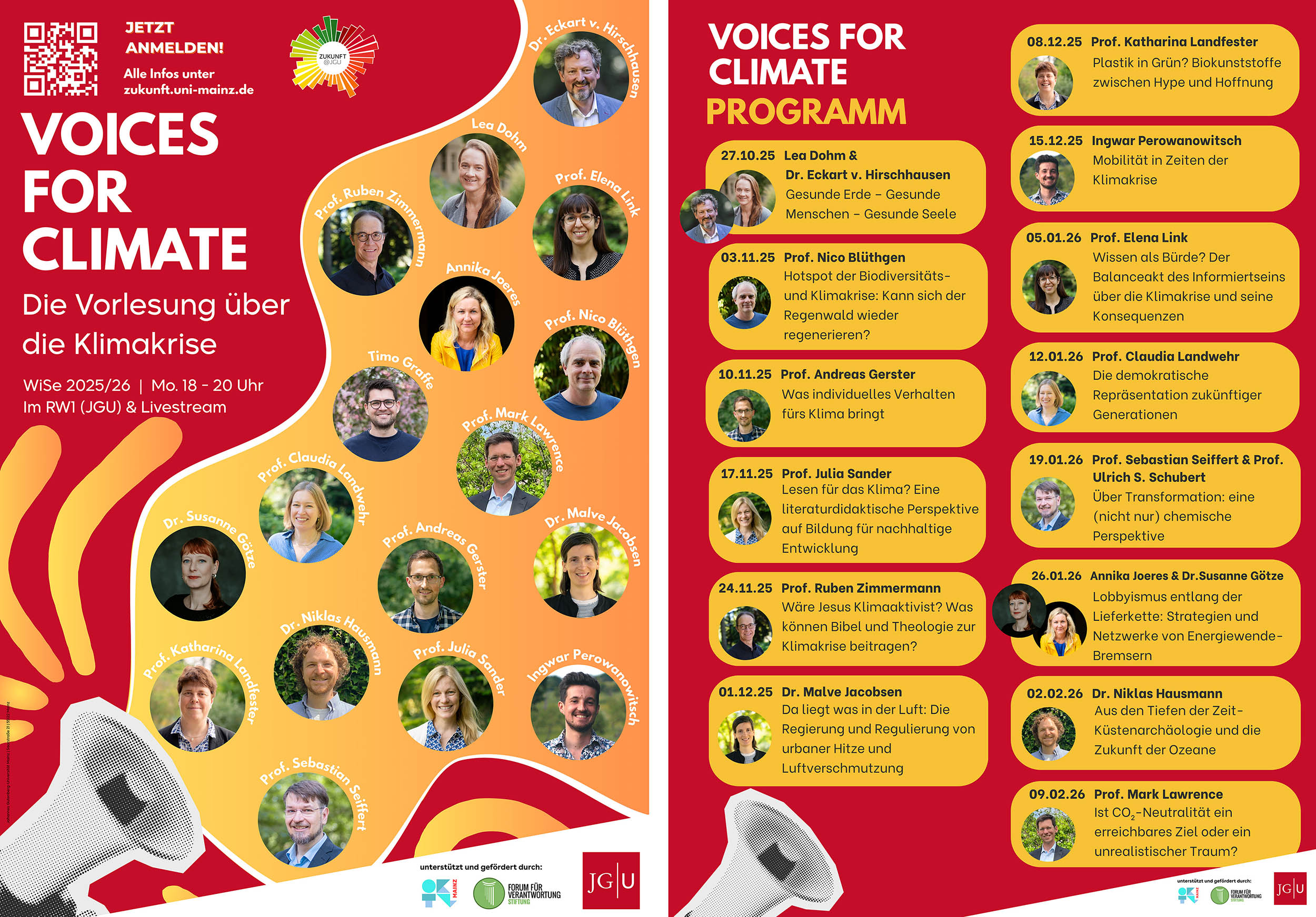 Grußworte sprechen die rheinland-pfälzische Klimaschutzministerin Katrin Eder, Wissenschaftsminister Clemens Hoch sowie Prof. Dr. Stephan Jolie, Vizepräsident für Studium und Lehre der Johannes Gutenberg-Universität Mainz. Die Laudatio halten die Preisträger*innen des vergangenen Jahres, Dr. Cecilia Scorza und Prof. Dr. Harald Lesch (per Videobotschaft).