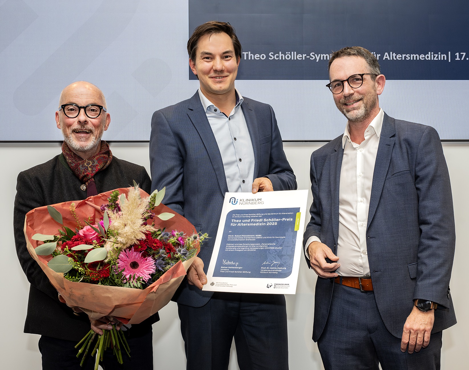 Der Theo und Friedl Schöller-Preis 2025 geht an PD Dr. Robert Fleischmann und sein Team für die Studie CONFESS zu Wirbelsäulen-OPs im Alter. Das Zentrum für Altersmedizin am Klinikum Nürnberg und die Theo und Friedl Schöller-Stiftung würdigen damit wissenschaftlich überzeugende Altersforschung.