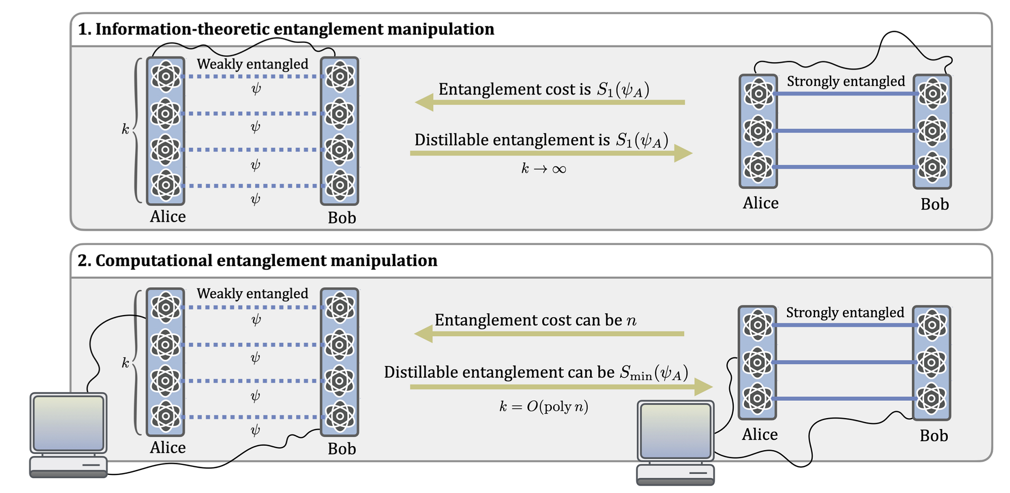 This realization has led the team of researchers to introduce two key figures of merit in quantum physics: the computational distillable entanglement and the computational entanglement cost. These two figures quantify rates of entanglement in quantum states, in the form of entangled bits (ebits), within certain restricted conditions.