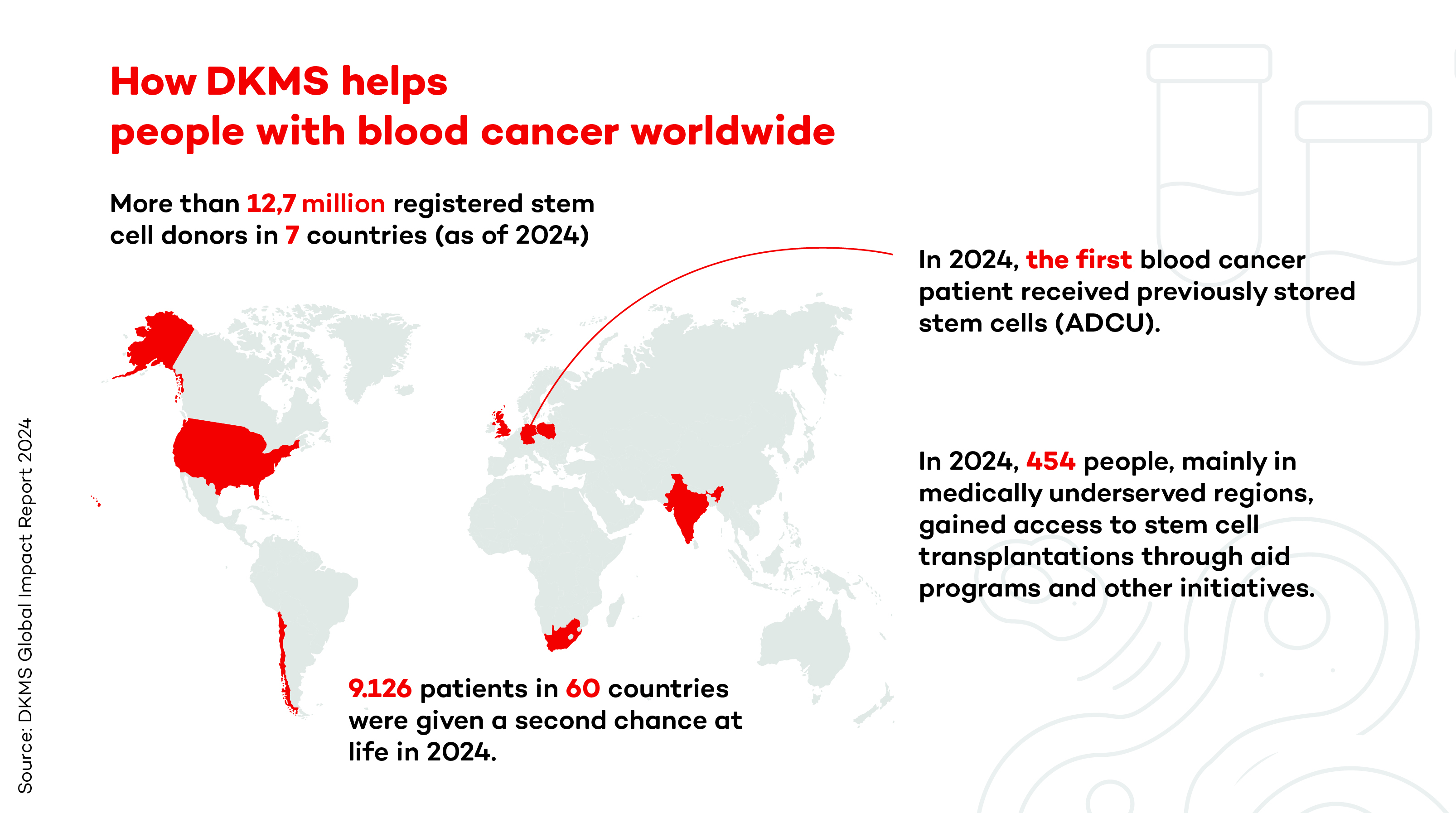 In 2024, 9,126 people in 60 countries received a second chance at life through a DKMS stem cell donation. Up to and including 2024, DKMS enabled an additional 2,275 people, primarily in medically underserved regions, to access lifesaving transplants through aid programs and other initiatives, including 454 in 2024.