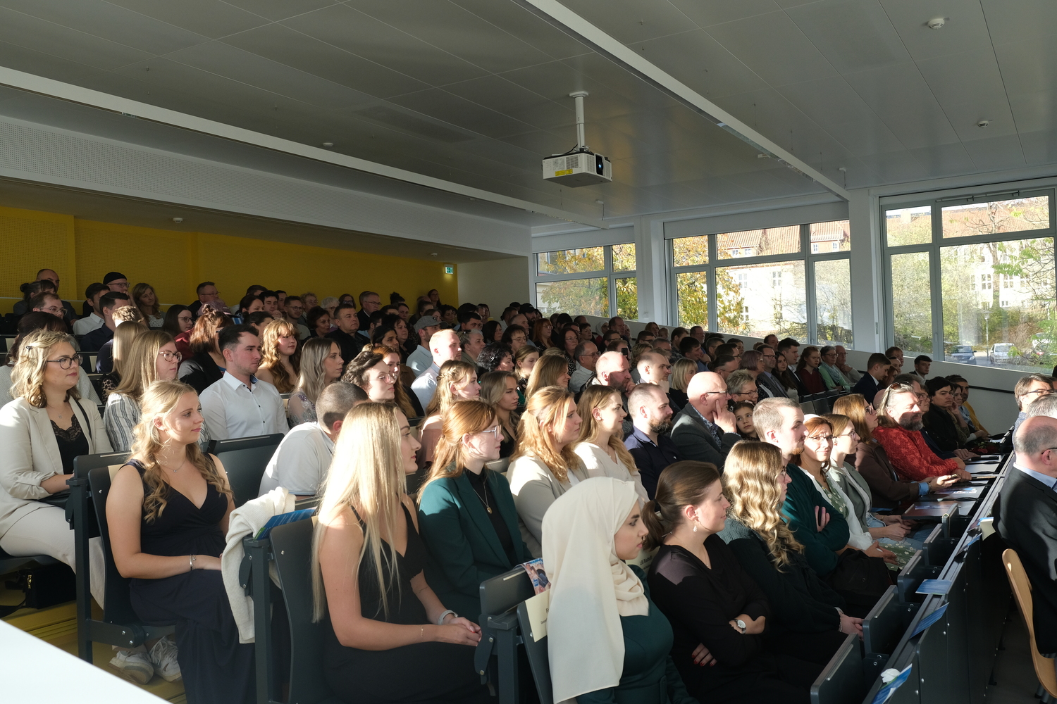 Die Veranstaltung begann um 16 Uhr und bot den zahlreichen Gästen – darunter Familien, Freundinnen und Freunde der frisch gebackenen Alumni – eine feierliche Mischung aus Grußworten, Festreden u.a. von Oberbürgermeister Kai Buchmann und musikalischen Beiträgen. Die Resonanz war groß: Die Hörsäle waren sehr gut gefüllt, und die festliche Stimmung machte deutlich, welche Bedeutung dieser Tag für die gesamte Hochschulgemeinschaft hatte.