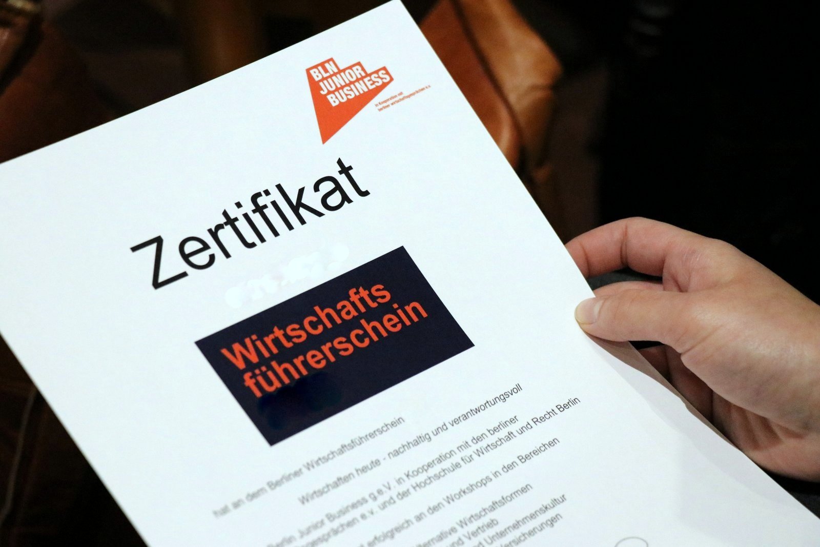 Der Wirtschaftsführerschein ist ein praxisnahes Zertifikat mit vier Workshops von Experten und Expertinnen: Markt und Vertrieb, Finanzen und Versicherungen, Führung und Unternehmenskultur sowie alternative Wirtschaftsformen. Die Schüler und Schülerinnen arbeiten in kleinen Teams, entwickeln eigene Ideen, erleben Wirtschaft hautnah an einer echten Hochschule, tauschen sich mit Berliner Unternehmen aus und setzen gemeinsam ein kleines Abschlussprojekt um. Am Ende gibt es eine feierliche Preisverleihung und eine Unternehmensmesse, den „Markt der Möglichkeiten“, bei der sie Kontakte für Praktika, Studium und Ausbildung knüpfen können.
