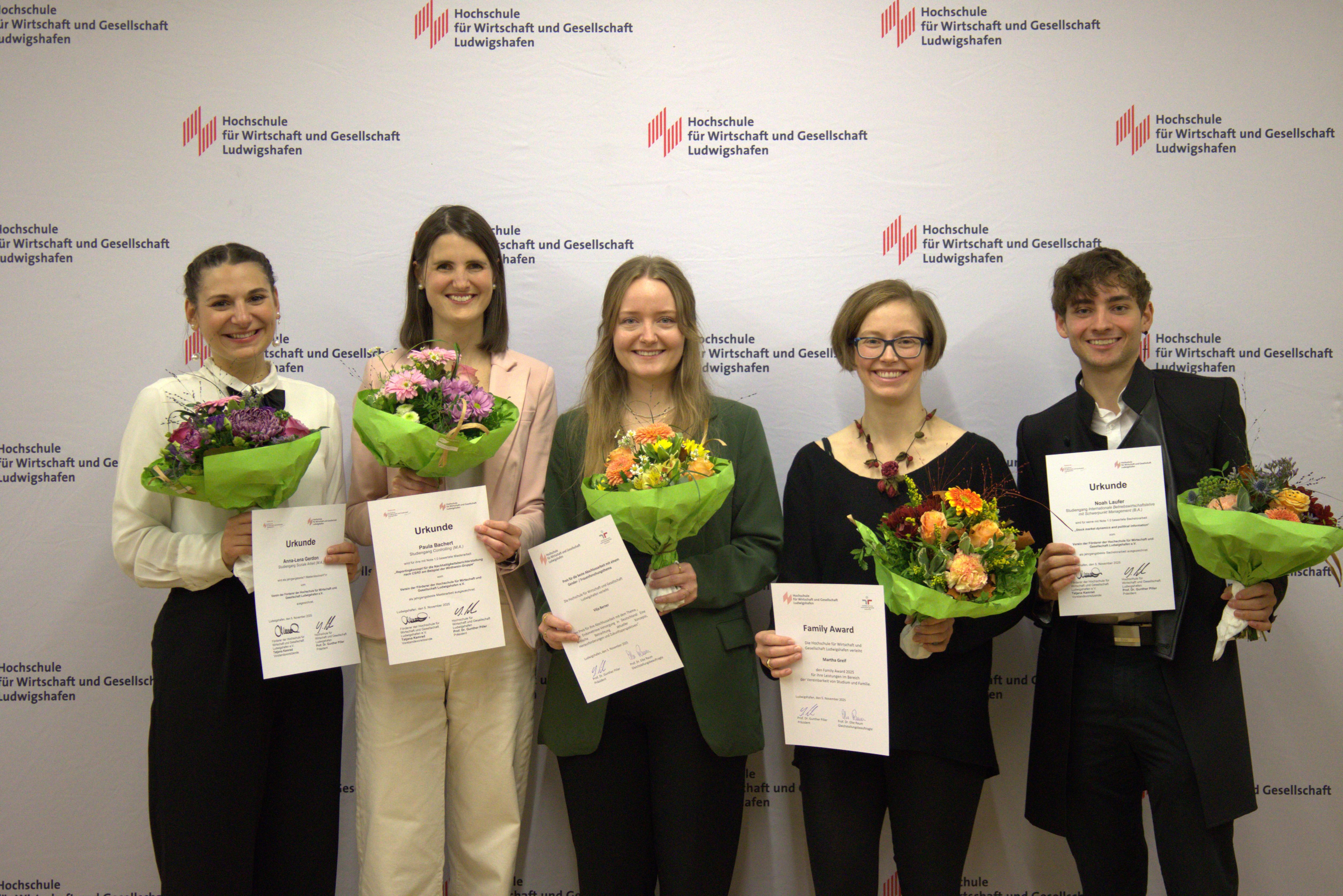 Am Mittwoch, 5. November 2025, standen an der Hochschule für Wirtschaft und Gesellschaft Ludwigshafen (HWG LU) erneut herausragende Studienleistungen im Mittelpunkt: Im Rahmen eines kleinen Festakts wurden die diesjährigen Förderpreise des Vereins „Förderer der Hochschule für Wirtschaft und Gesellschaft Ludwigshafen e.V.“ sowie die Preise der Gleichstellung verliehen. Wie in den vergangenen Jahren würdigten Hochschule, Förderverein und Gleichstellung damit das besondere Engagement und die exzellenten Leistungen ihrer Studierenden und Absolvent*innen.
