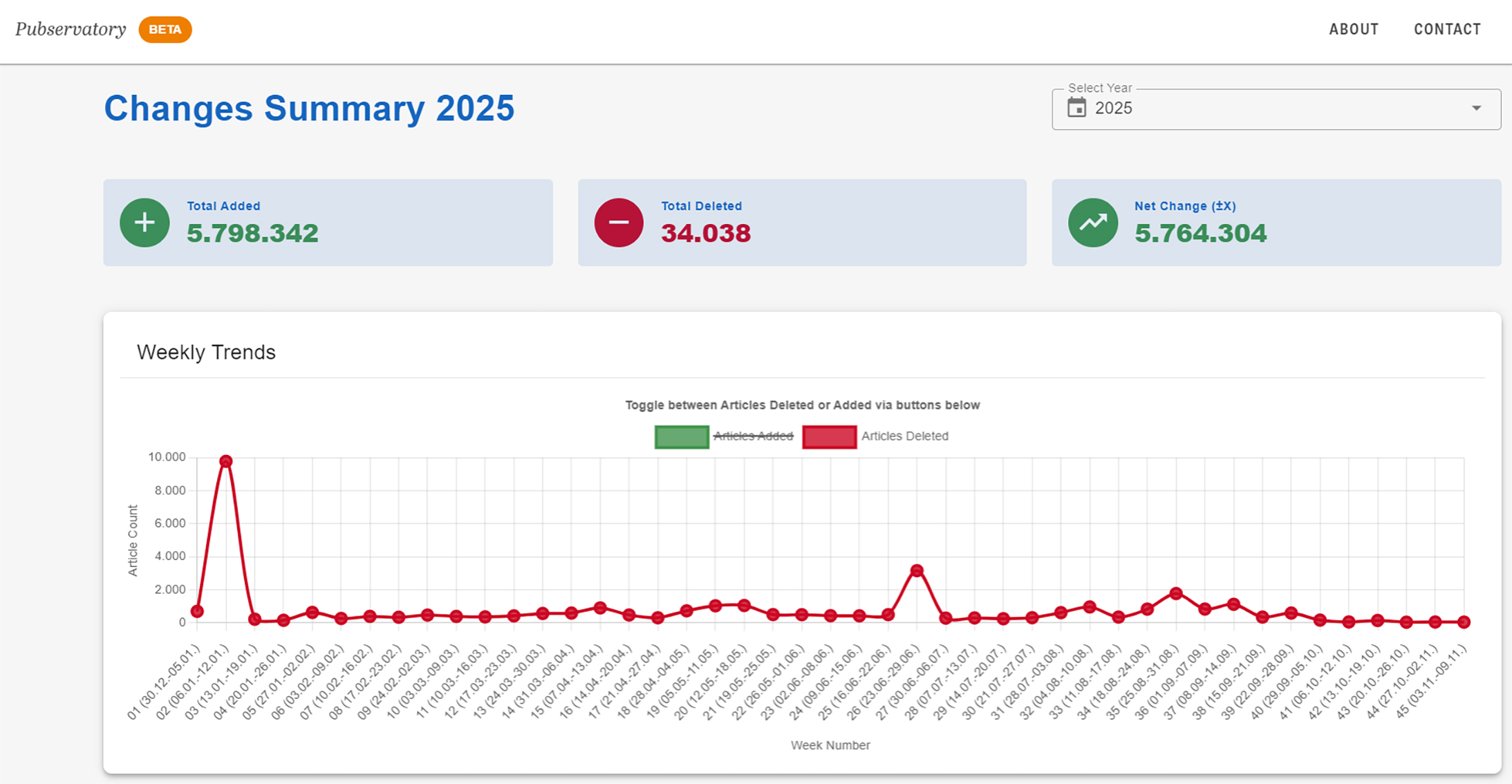 Neben den neuaufgenommenen werden auch gelöschte Datensätze aufgezeigt. Diese Löschungen betreffen zumeist Dubletten, also Mehrfacheinträge für denselben Artikel. Die Information über einen Artikel bleibt damit in der Datenbank erhalten – entfernt wird nur der wiederholt veröffentlichte Datensatz. Pubservatory trägt dazu bei, diese Veränderungen erkennbar zu machen. Eine kommende Version des Tools, geplant für das Frühjahr 2026, wird Dublettenlöschungen gezielt ausweisen und so noch deutlicher machen, welche Art von Änderung jeweils vorgenommen wurde.