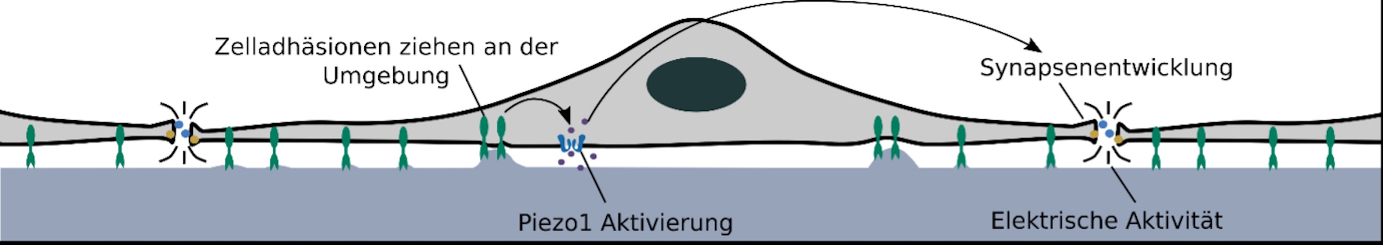 Um zu verstehen, wie Nervenzellen ihre mechanische Umgebung wahrnehmen, untersuchte das Team genetisch veränderte Neuronen. So konnten sie bestimmte Proteine in Neuronen eliminieren und Prozesse wie die Synapsenbildung und die elektrische Signalübertragung unter kontrollierten Bedingungen untersuchen. Die Forscher*innen fanden heraus, dass sowohl die Synapsenbildung als auch die elektrische Aktivität von der Steifigkeit der Umgebung abhängen. Neuronen nehmen diese Steifigkeit über den mechanosensitiven Ionenkanal Piezo1 wahr. Die Wissenschaftler*innen maßen dann die Expression Tausender Gene und entdeckten, dass Piezo1 die neuronale Entwicklung in steiferen Umgebungen verzögert, indem es die Expression von Transthyretin reduziert – einem Protein, von dem kürzlich gezeigt wurde, dass es die Synapsenbildung reguliert. Durch die Aufdeckung dieses Signalwegs konnte das Team aufzeigen, wie die Wahrnehmung von Steifigkeit mit molekularen Mechanismen zusammenhängt, die die neuronale Entwicklung steuern.