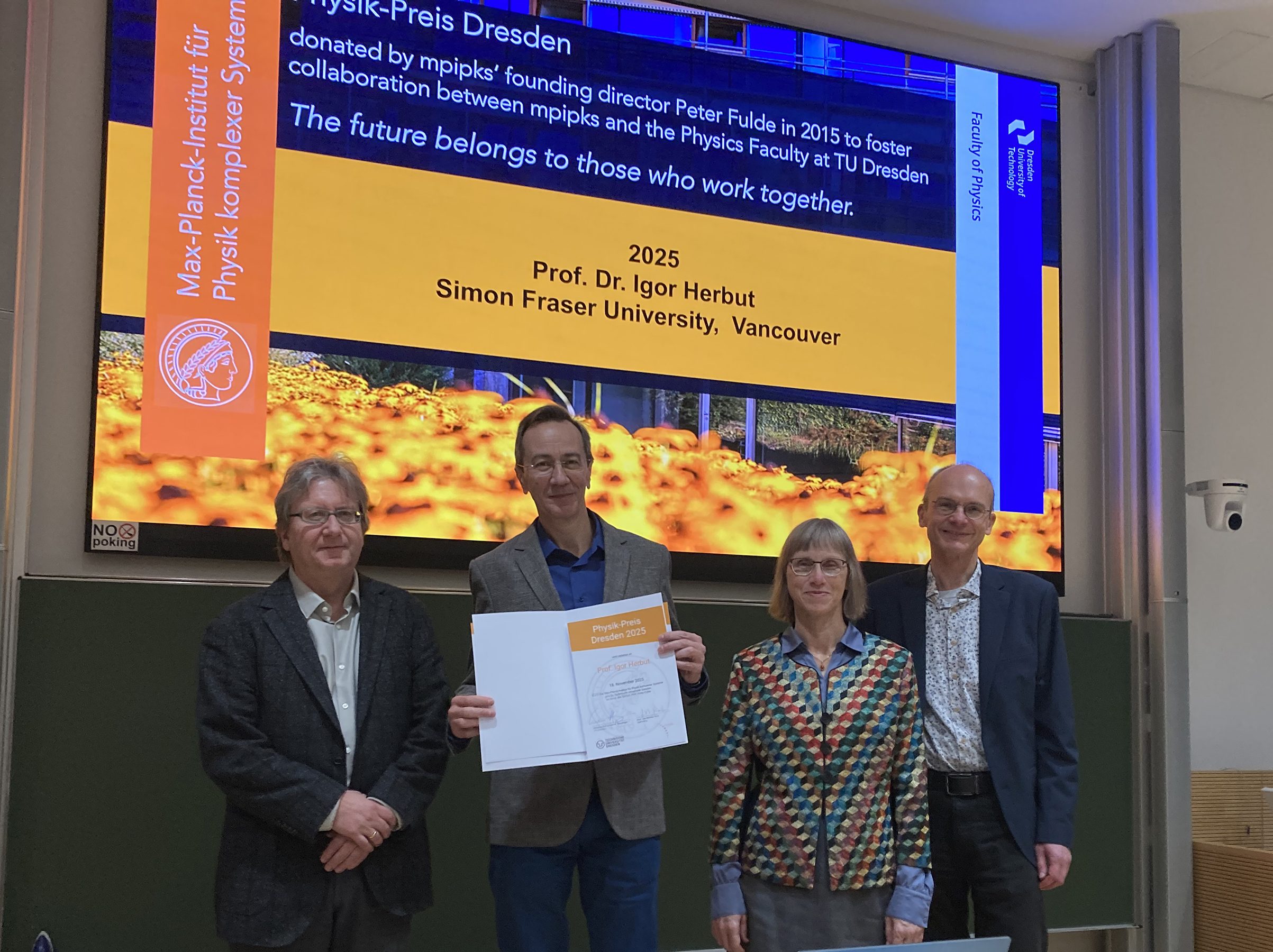 Am 18. November 2025 wurde der Physik-Preis Dresden 2025 an Prof. Igor Herbut von der Simon Fraser University in Kanada verliehen. Für einen theoretischen Physiker ist es besonders schön, universelle Merkmale in scheinbar unterschiedlichen Kontexten zu entdecken. Igor Herbut ist dafür ideal qualifiziert. Prof. Herbut ist ein weltweit führender theoretischer Physiker mit ausgeprägten mathematischen Neigungen und einem breiten Interesse an kondensierter Materie, statistischer Physik und Feldtheorie.
