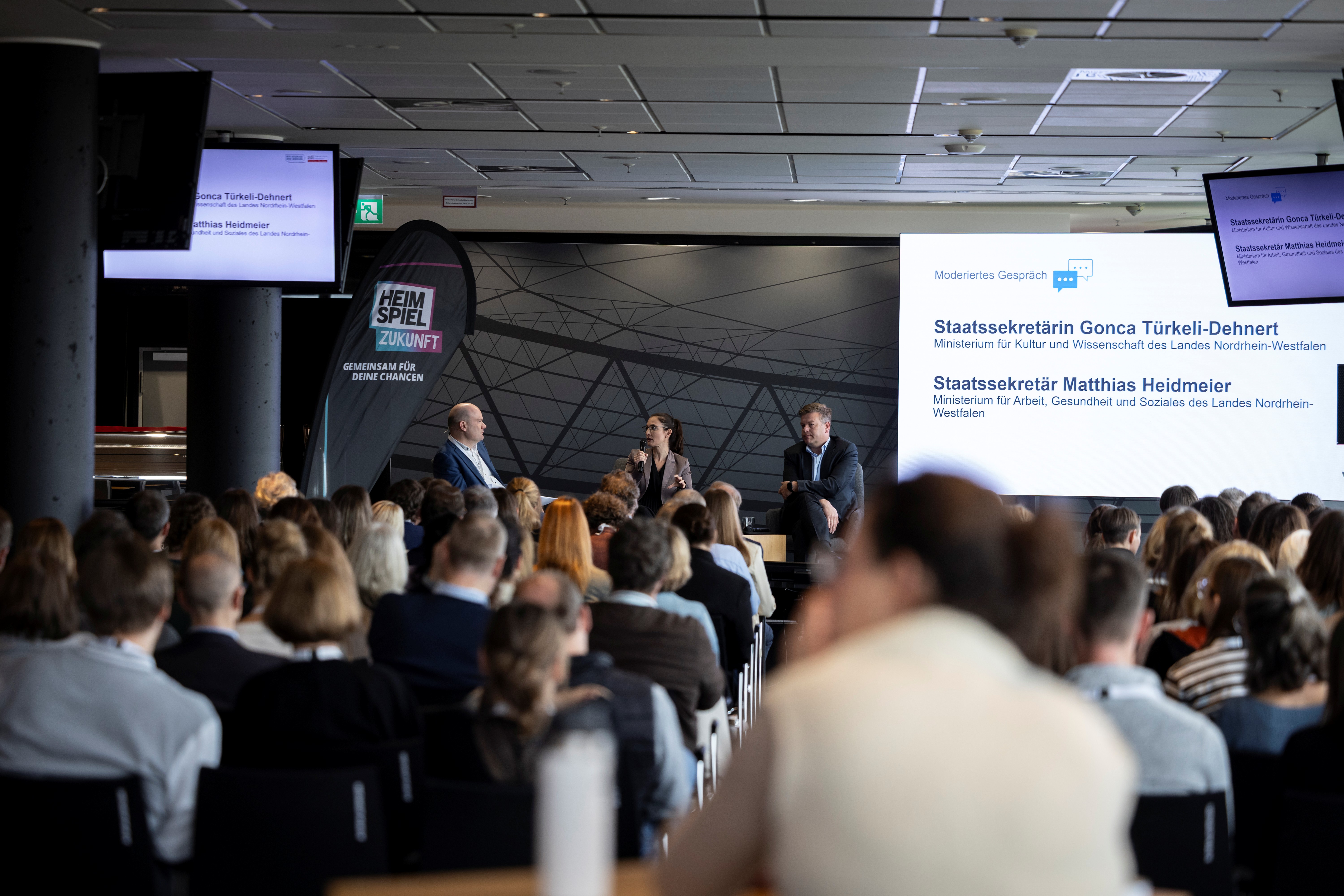 Unter dem Titel „Gemeinsam für den Fachkräftenachwuchs in NRW“ fand am 14.11.2025 eine gemeinsame Veranstaltung der Landesinitiativen Zukunft durch Innovation.NRW (zdi.NRW) und "Kein Abschluss ohne Anschluss" (KAoA) in der BayArena Leverkusen statt. Das Ministerium für Kultur und Wissenschaft (MKW) und das Ministerium für Arbeit, Gesundheit und Soziales (MAGS) hatten Vertreter:innen der beiden Initiativen dazu eingeladen. Gonca Türkeli-Dehnert, Staatssekretärin im MKW, und Matthias Heidmeier, Staatssekretär im MAGS, betonten, dass zdi.NRW und KAoA als NRW-weite Programme einen wichtigen Beitrag zur beruflichen Orientierung und Fachkräftesicherung leisten.