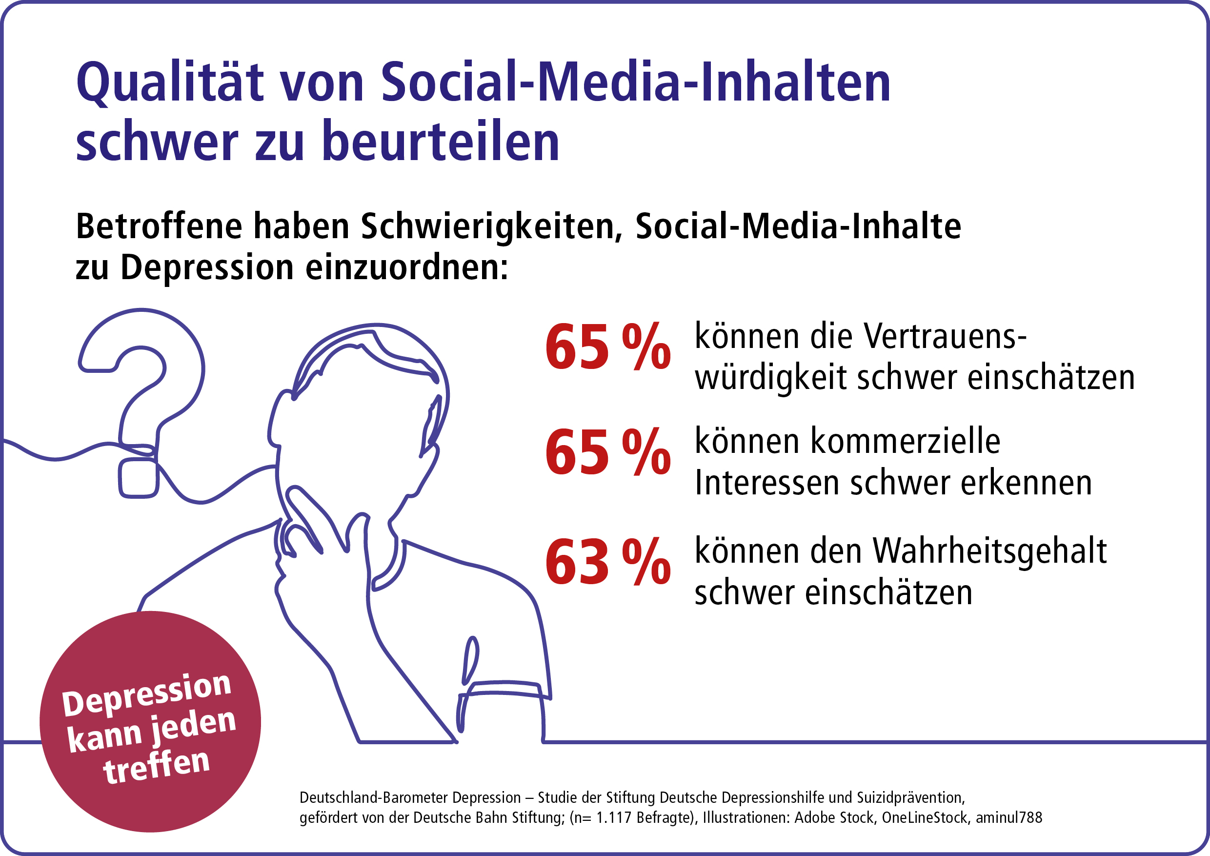Andererseits geben 65% der Befragten an, die Vertrauenswürdigkeit von Social Media Posts zu Depression schwer beurteilen zu können. Ebenso viele erkennen kommerzielle Interessen nur schwer. 63% haben Probleme, den Wahrheitsgehalt der Beiträge zu bewerten. „Wer sich bei Social Media über Depression informieren will, sollte prüfen, ob der Beitrag von einer Universität, einer Krankenkasse oder einer Fachorganisation für psychische Erkrankungen kommt. Hat die Person eine anerkannte Ausbildung für psychische Erkrankungen wie Psychiater oder Psychologischer Psychotherapeut? Besondere Vorsicht ist bei Angeboten geboten, die schnelle Heilung versprechen oder Produkte verkaufen. Nutzer sollten zudem darauf achten, ob sich die Informationen mit den nationalen Behandlungsleitlinien Depression decken“, empfiehlt Hegerl.