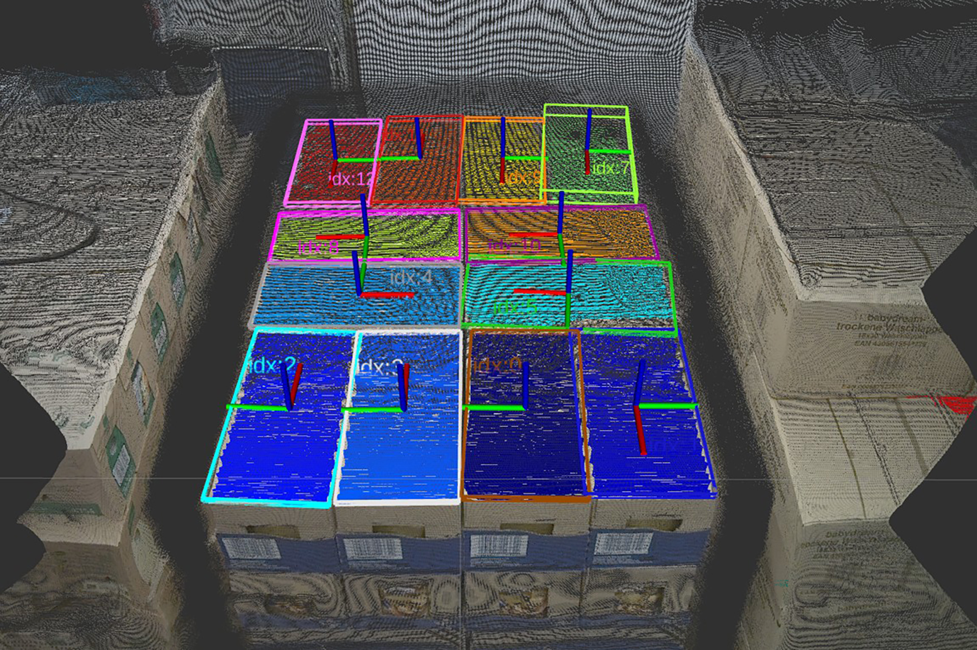 „Die Rahmenbedingungen in einem Warenlager sind für eine Kameraerkennung nicht einfach“, so Prof. Dr. Kaupp. „Z. B. ändern sich die Lichtbedingungen ständig und es geht sehr eng zu in den Regalen, so dass man die Pakete nur schwer erkennt.“ Prof. Dr. Willert ergänzt: „Unser innovativer Ansatz war, Methoden des Maschinellen Lernens mit klassischen Methoden zu kombinieren, denn wir konnten uns die geometrischen Eigenschaften der Pakete zu Nutze machen. Für das Maschinelle Lernen haben wir eine Pipeline entwickelt, die eine Vielzahl von synthetischen Bilddaten generiert und mit Bildern von echten Texturen anreichert. Dadurch konnten wir den sogenannten ,Sim-To-Real-Gap‘, also die Lücke zwischen der Simulation und der echten Welt, minimieren“.