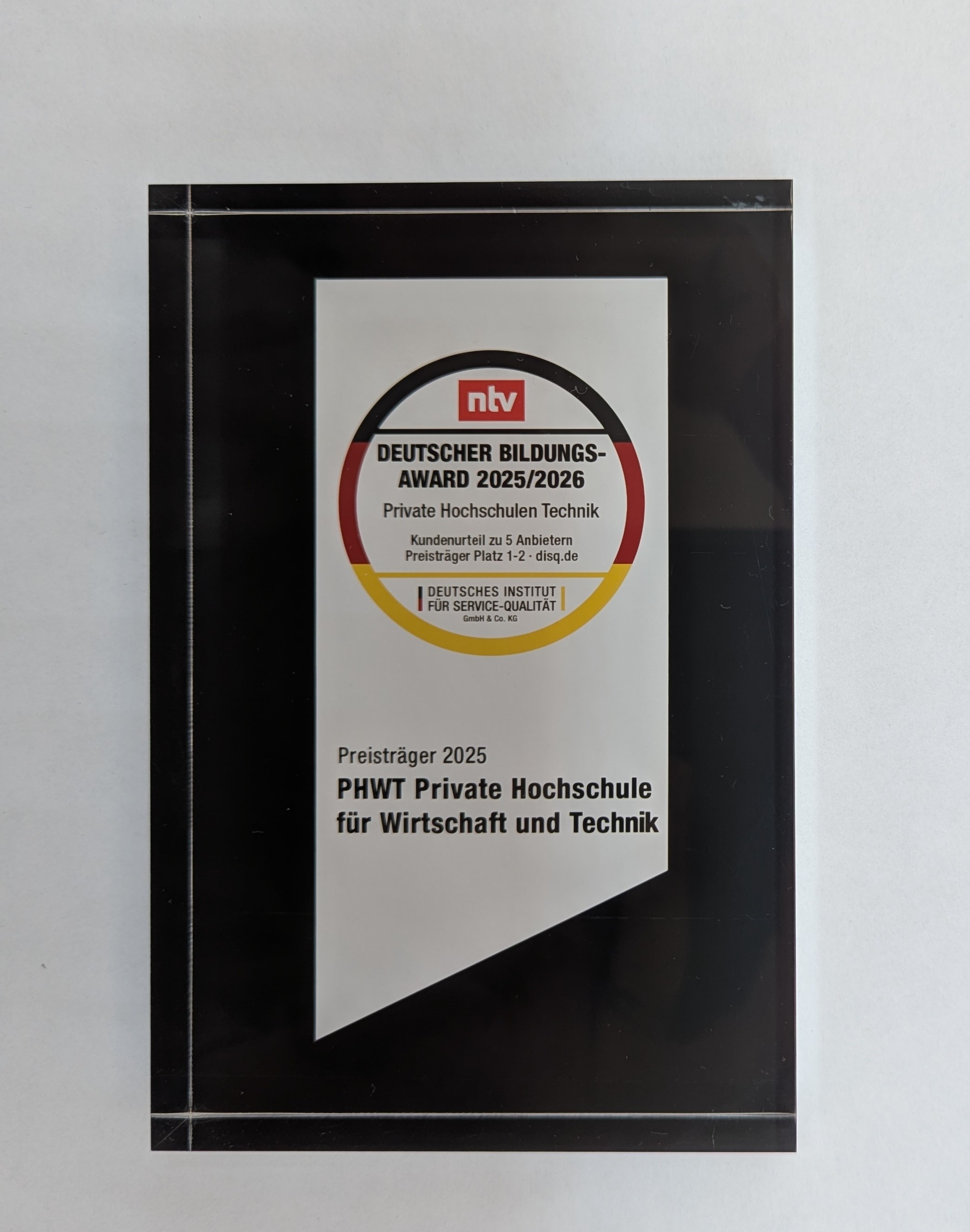 Der Deutsche Bildungs-Award zählt zu den wichtigsten Auszeichnungen und wird Bildungsanbietern aus insgesamt 47 Kategorien verliehen. Die PHWT erhielt unter den privaten Hochschulen den ersten Platz in der Kategorie “Hochschulen für Technik“. In die Bewertung flossen zahlreiche Aspekte ein – von Qualität und Nutzen bzw. Aktualität der Studiengänge über Beratungskompetenz und Zuverlässigkeit bis hin zu Freundlichkeit und der Bereitschaft die PHWT weiterzuempfehlen.