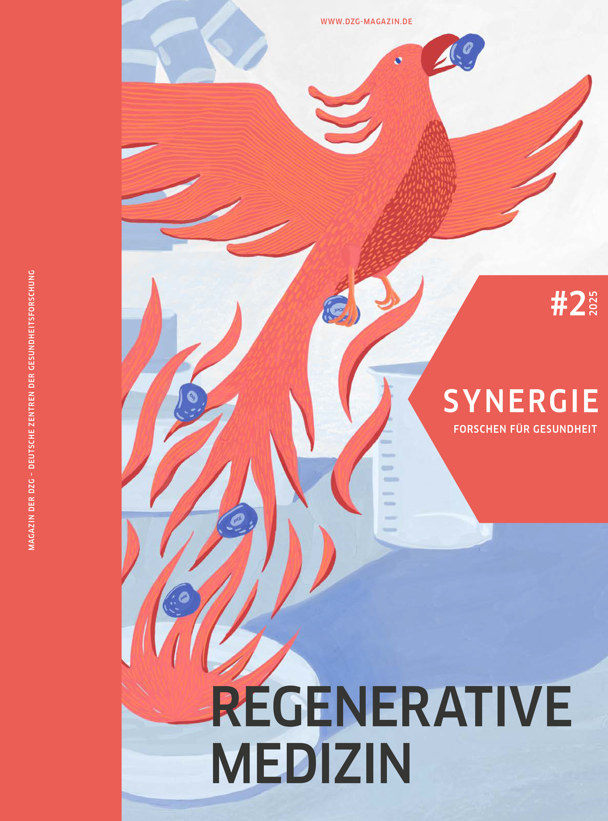 Zell- und Gentherapien markieren einen Paradigmenwechsel in der Medizin: Sie nutzen lebende Zellen zur Therapie von Erkrankungen. Erste Anwendungen zeigen ihr großes Potenzial bei Tumoren, Autoimmun- oder Stoffwechselerkrankungen. Dabei werden Gewebe und Organfunktionen wiederhergestellt oder erneuert – wie der „Phönix aus der Asche“ auf dem Titelbild der SYNERGIE kann Gesundheit neu entstehen. Die Deutschen Zentren der Gesundheitsforschung (DZG) arbeiten daran, diese Ansätze aus der Grundlagenforschung in die klinische Praxis zu bringen und damit neue Perspektiven für Patient:innen zu eröffnen. Welche Ergebnisse die DZG erzielt haben, beschreibt die neue Ausgabe der SYNERGIE.