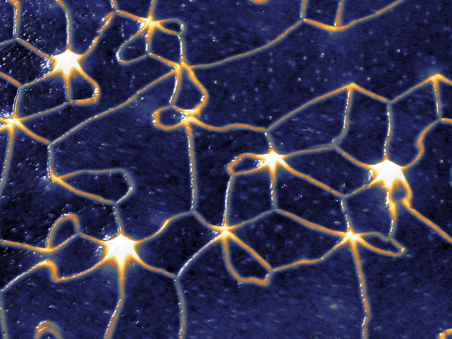 Forschende des Fachbereichs Physik der Universität Hamburg haben ein magnetisches Netzwerk auf der Nanometerskala in einer antiferromagnetischen Mangan-Schicht realisiert. Die Übergänge zwischen verschiedenen magnetisch geordneten Bereichen (Domänen) des Netzwerks wurden auf der atomaren Skala abgebildet, wobei die Kreuzungspunkte der Domänenwände eine Händigkeit (Chiralität) aufwiesen. Die beobachtete Chiralität kann durch eine magnetisch getriebene Scherung der Mangan-Schicht erklärt werden wie theoretische Physikerinnen und Physiker der Christian-Albrechts-Universität (CAU) zu Kiel zeigen konnten. Die Ergebnisse wurden in der Fachzeitschrift „Nature Communications“ veröffentlicht.