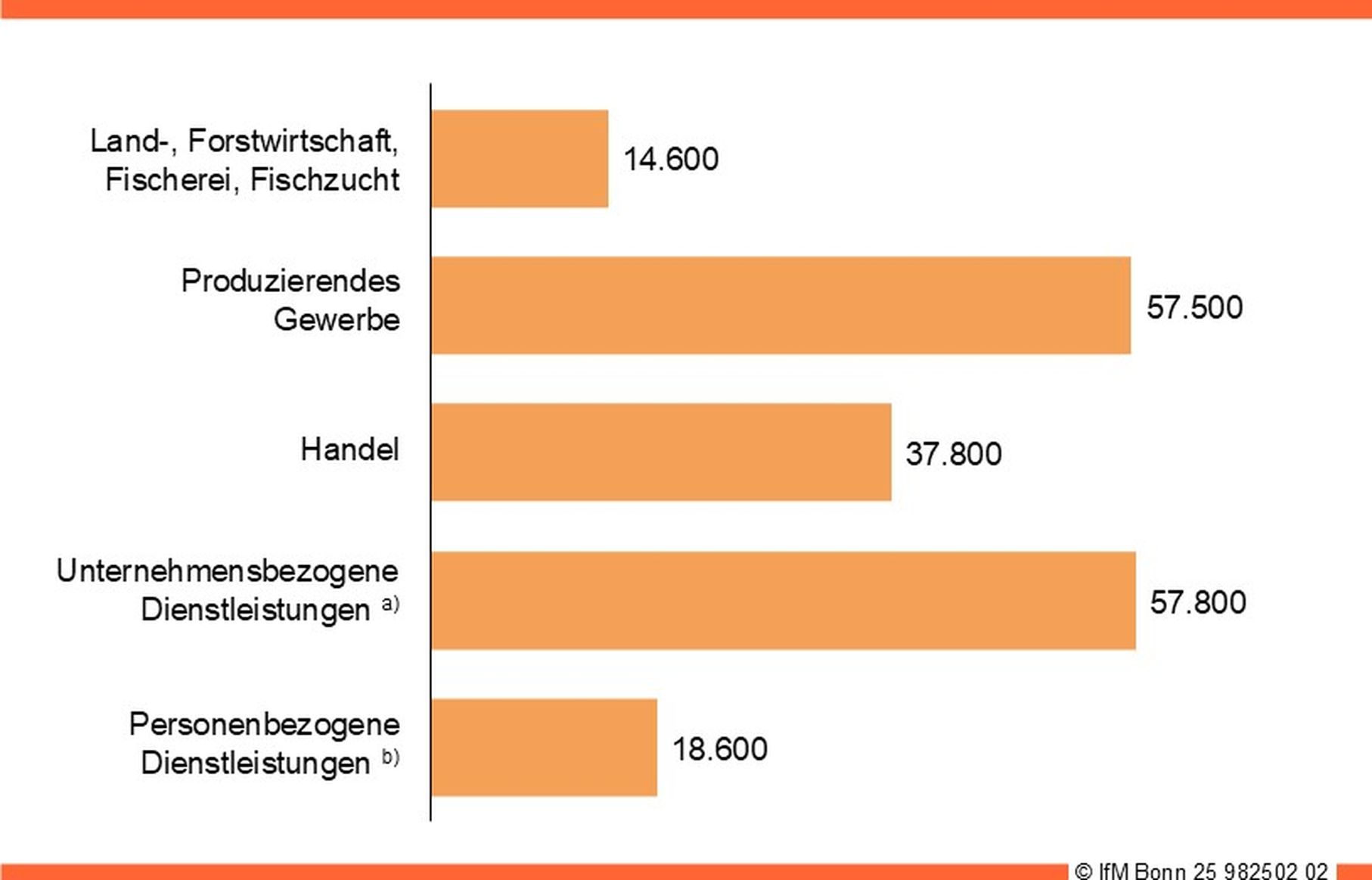 Die IfM-Wissenschaftlerinnen und Wissenschaftler erwarten, dass rund 30 % aller Übergaben jeweils im Produzierenden Gewerbe und im Bereich der Unternehmensbezogenen Dienstleistungen stattfinden. Aus dem Handel kommt hingegen nur gut jedes 6. der im Schätzzeitraum übertragenen Unternehmen.