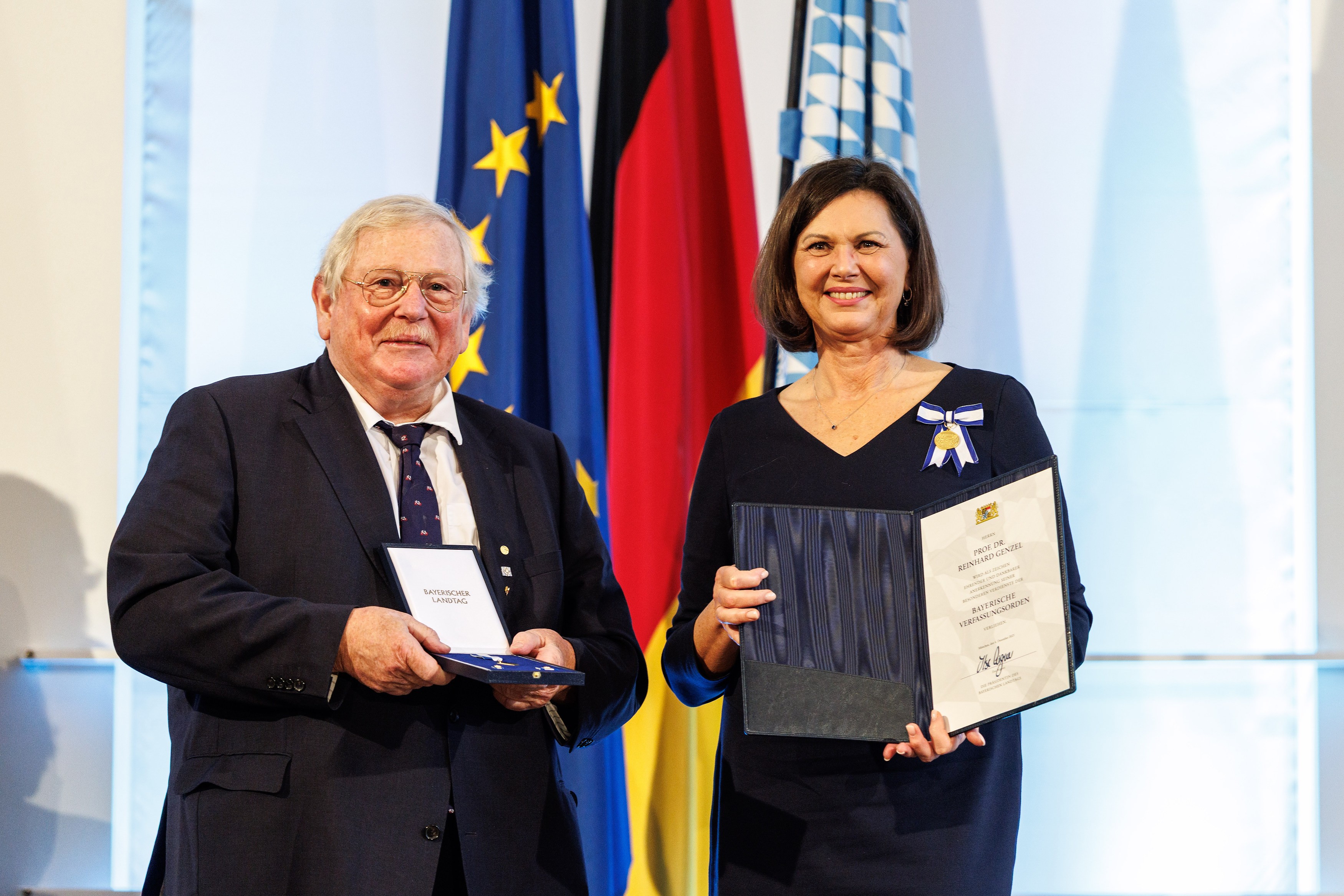 Prof. Dr. Reinhard Genzel, Direktor der Infrarot-/Submillimeter-Gruppe am Max-Planck-Institut für extraterrestrische Physik (MPE) und Nobelpreisträger für Physik 2020, ist am 4. Dezember 2025 mit dem Bayerischen Verfassungsorden ausgezeichnet worden. Ilse Aigner, Präsidentin des Bayerischen Landtags, verlieh die Auszeichnung im Senatssaal des Maximilianeums im Rahmen der Woche des Verfassungstags des Freistaats Bayern.
