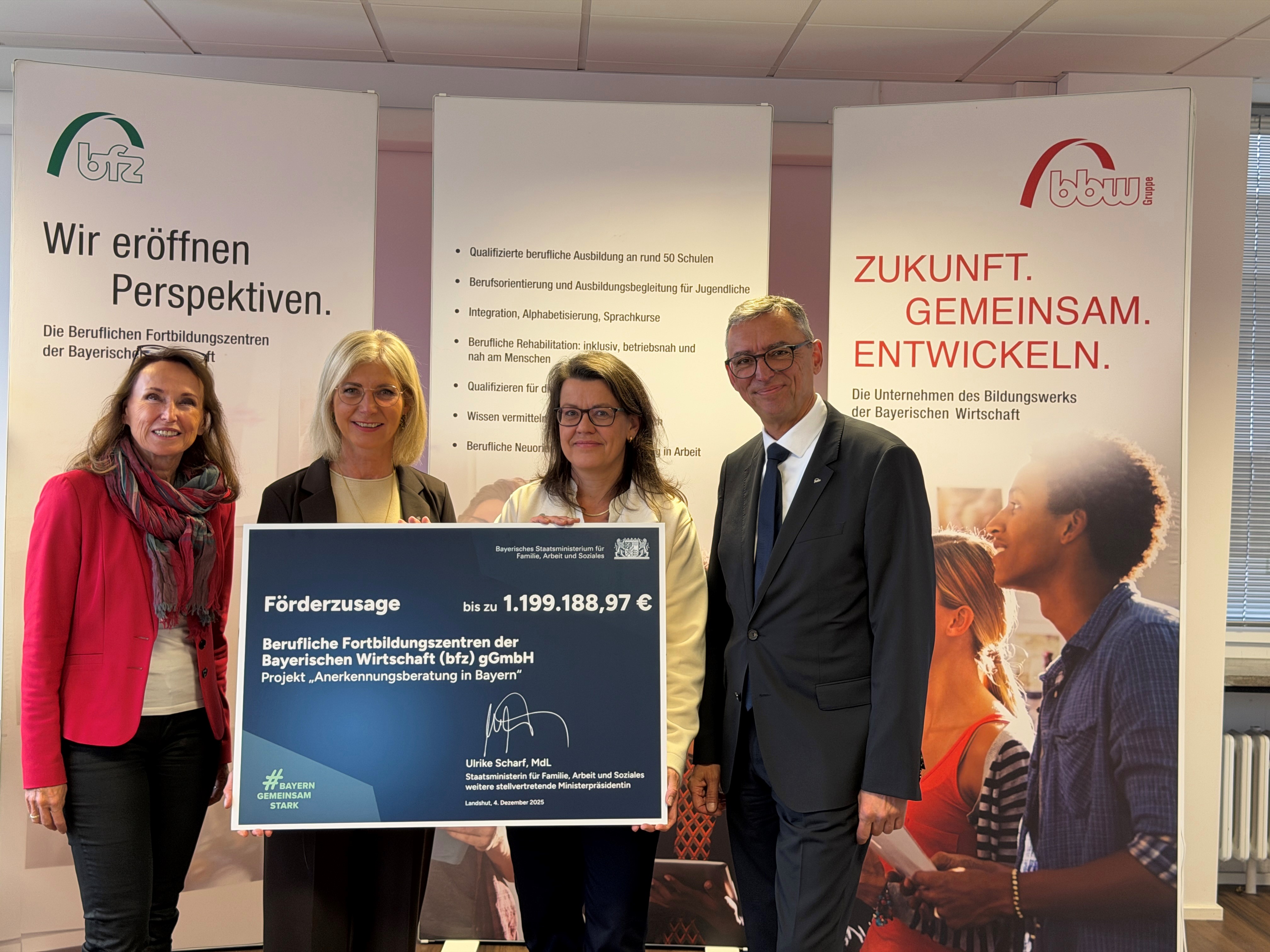 Landshut, 04.12.2025 – Der Freistaat Bayern setzt ein deutliches Zeichen gegen den Fachkräftemangel: Das Bayerische Staatsministerium für Familie, Arbeit und Soziales verlängert die Förderung der „Anerkennungsberatung Bayern“ um zwei weitere Jahre und investiert in das Angebot rund 1,2 Millionen Euro. Bei einem Besuch am Standort Landshut der beruflichen Fortbildungszentren (bfz) überreichte Staatsministerin Ulrike Scharf, MdL, heute den offiziellen Förderscheck und würdigte die Arbeit des Projekts, das seit knapp zehn Jahren eine zentrale Rolle bei der Integration internationaler Fachkräfte spielt.