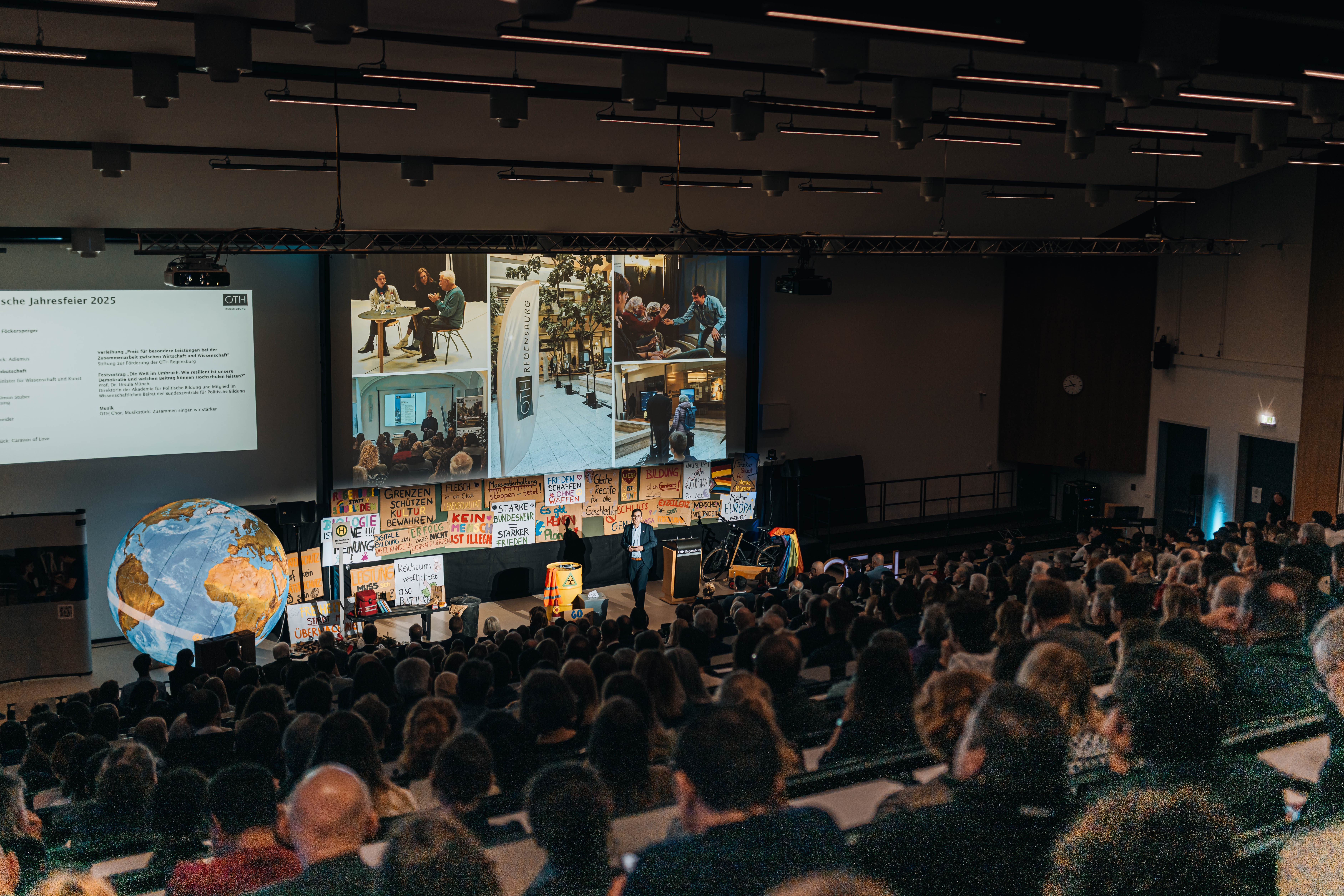 Der größte Hörsaal der OTH Regensburg verwandelte sich in einen Ort der Reflexion, des Aufbruchs und des gemeinsamen Bekenntnisses zu Demokratie, Vielfalt und wissenschaftlichen Fortschritt. Mehr als 450 Gäste aus Politik, Wissenschaft, Wirtschaft und Gesellschaft sowie zahlreiche Mitarbeitende und Studierende folgten am Freitag, 5. Dezember 2025, der Einladung zur Akademischen Jahresfeier 2025. Schon beim Betreten des Saals bot sich ein außergewöhnliches Bühnenbild: eine riesige Weltkugel, flankiert von konträren gesellschaftlichen Parolen auf Demoplakaten, dazwischen eine Bushaltestelle, ein Atommüllfass, eine Pride-Flagge, ein E-Bike, ein abgestorbener Baum. Ein Sinnbild für die Spannungen und Brüche unserer Gegenwart, aber auch für die Aufgabe der Hochschule, Räume des Austauschs zu schaffen.