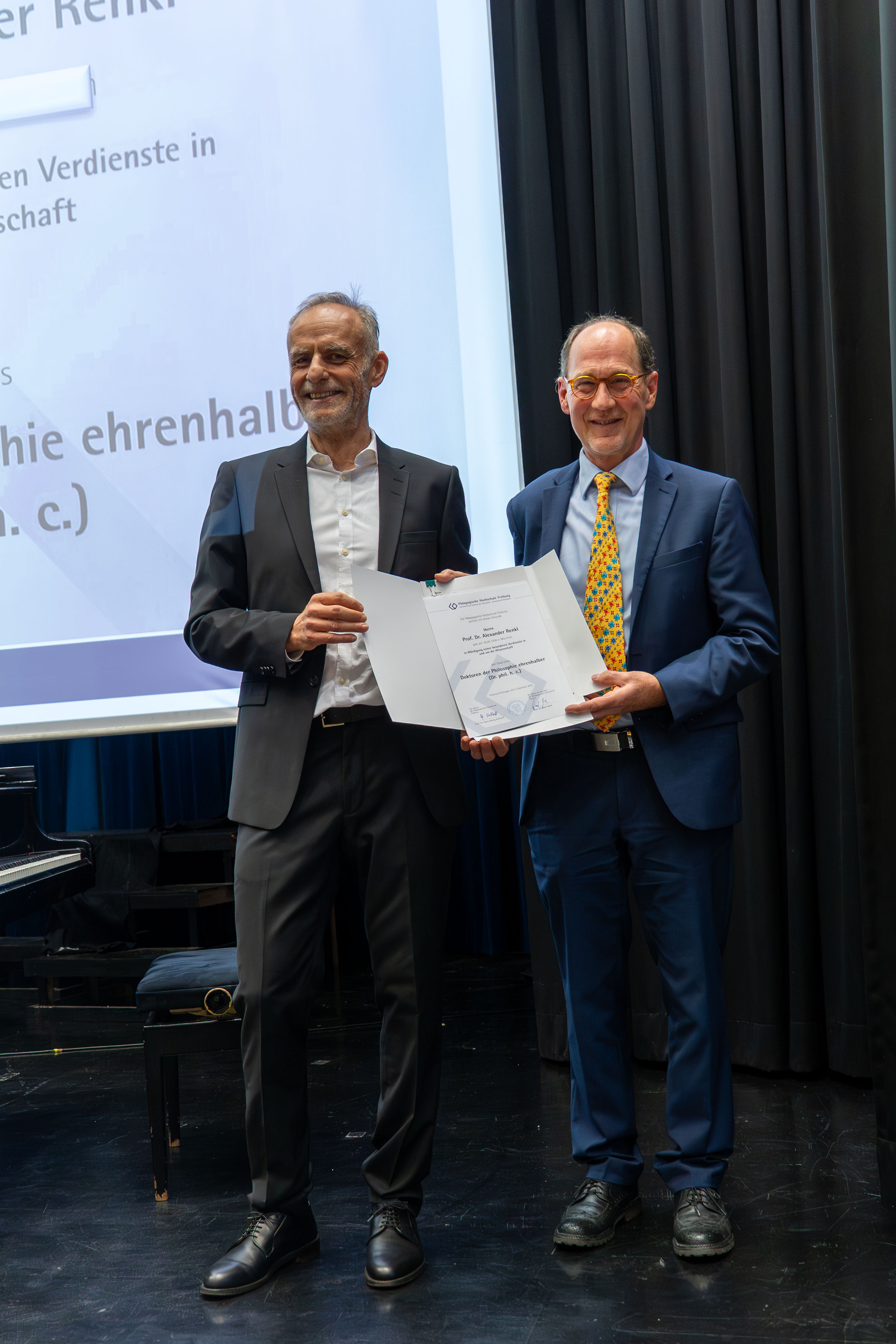 In einem feierlichen Akt hat die Pädagogische Hochschule Freiburg am 5. Dezember 2025 Prof. Dr. Alexander Renkl die Ehrendoktorwürde verliehen. Überreicht wurde die Auszeichnung von Prof. Dr. Josef Nerb, Dekan der Fakultät für Bildungswissenschaften. Josef Nerb würdigt in seiner Laudatio die herausragenden wissenschaftlichen Verdienste Renkls und dessen langjährigen Einfluss auf das Feld der Lehr-Lern-Forschung.
