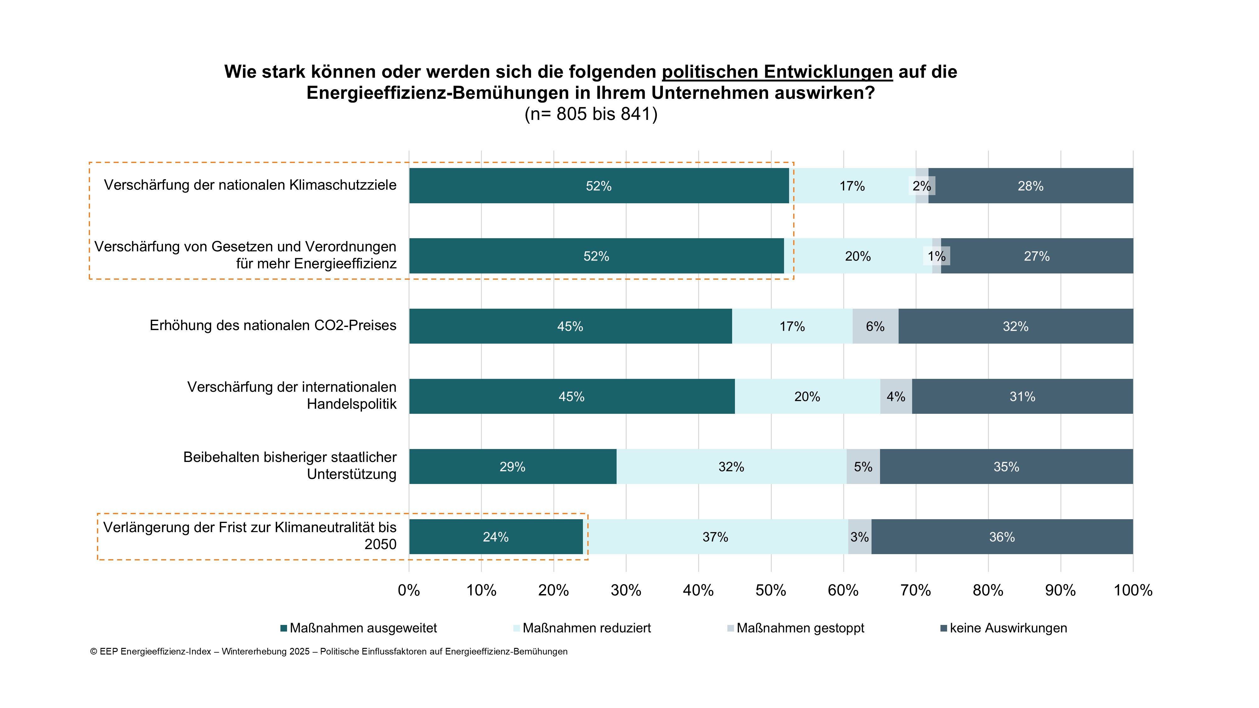 Politische Vorgaben mit Fokus auf nationale Ambitionssteigerungen beim Thema Klimaschutz haben die größten Auswirkungen auf die Energieeffizienz-Bemühungen: Jeweils 52% der Unternehmen würden bei der Verschärfung der nationalen Klimaschutzziele sowie von Gesetzen und Verordnungen die Maßnahmen für mehr Energieeffizienz ausweiten.