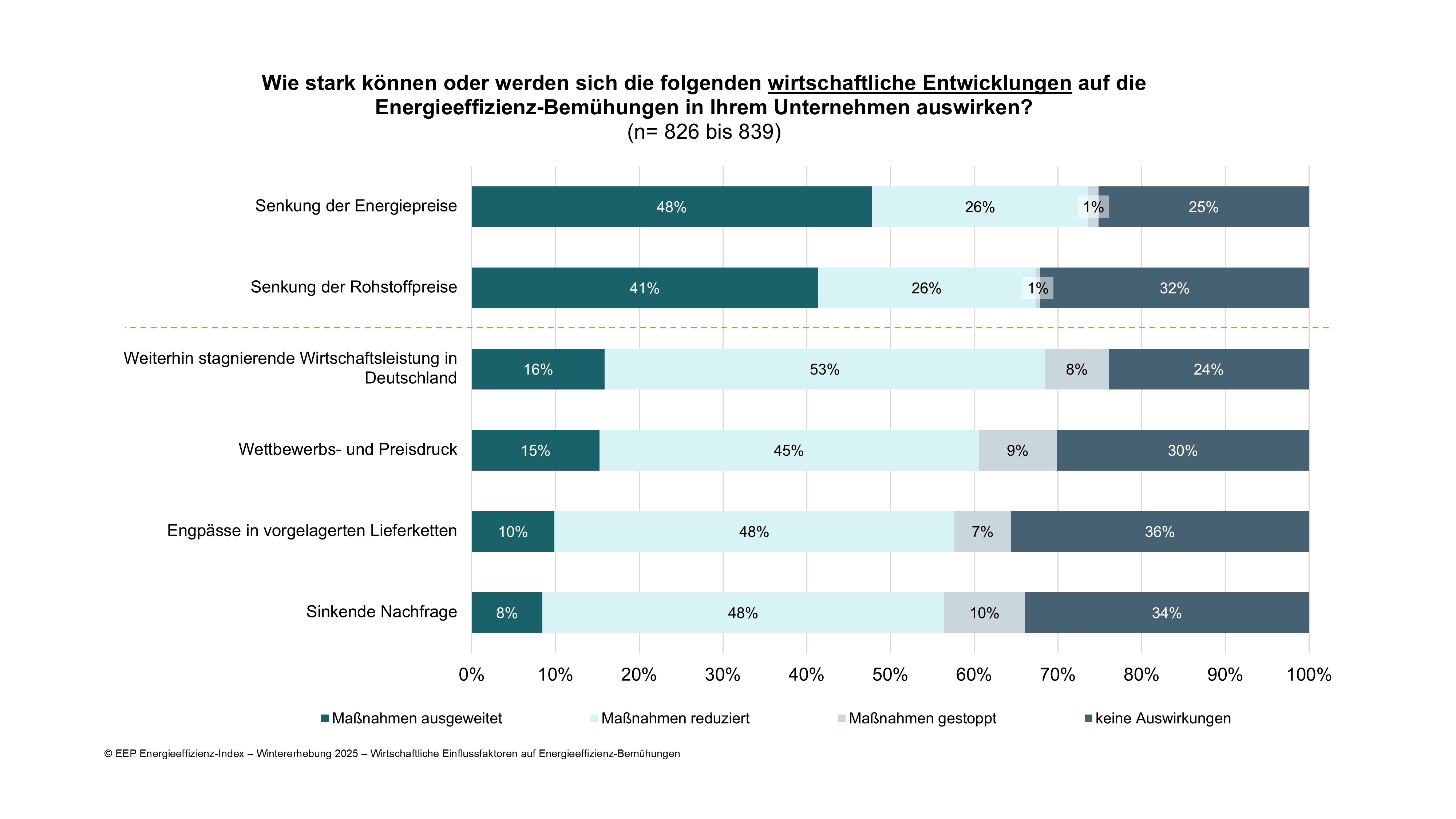 Das Institut für Energieeffizienz in der Produktion (EEP) der Universität Stuttgart erhebt seit 2013 halbjährlich aktuelle und geplante Aktivitäten der deutschen Industrie zur Energieeffizienz. Der Energieeffizienzindex (EEI) wird in Zusammenarbeit mit der Deutschen Energie-Agentur (dena), dem Bundesverband der Deutschen Industrie (BDI), dem Fraunhofer-Institut für Produktionstechnik und Automatisierung IPA und dem TÜV Rheinland sowie weiteren Partnern erstellt. Die Sonderfragen in der Wintererhebung 2025 adressierten die externen Einflussfaktoren auf Energieeffizienz-Bemühungen, langfristige und strategische Zielsetzungen sowie die Relevanz von Energieflexibilität. Insgesamt 844 Unternehmen des produzierenden Gewerbes haben im Erhebungszeitraum vom 15. September bis zum 31. Oktober 2025 an der Umfrage teilgenommen.