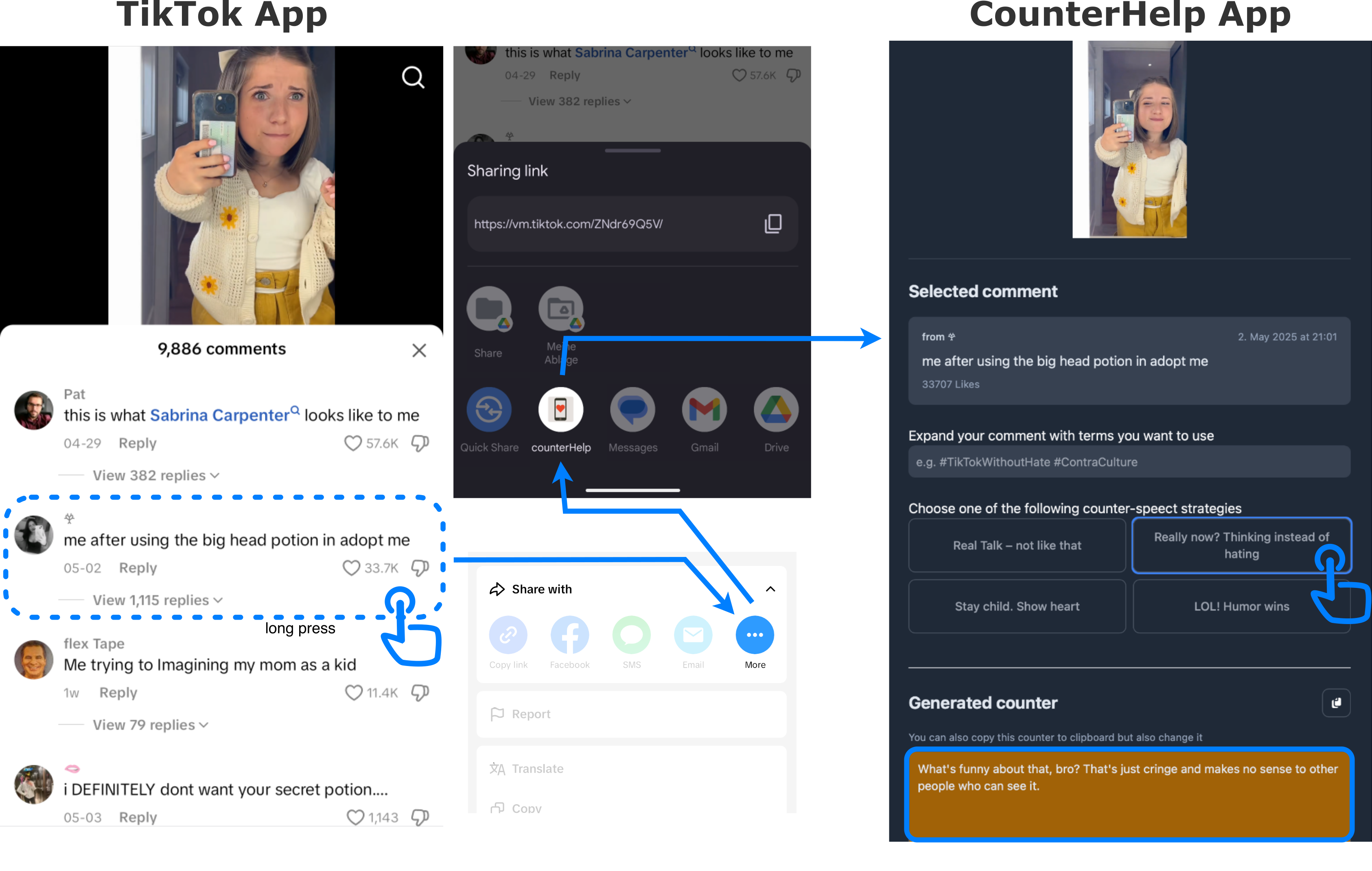 Ein zentrales Ergebnis des Counter-Speech-Projekts ist die Entwicklung der App „CounterHelp“. Jugendliche können mithilfe der App einfach eigene Gegenrede auf TikTok erstellen. Die App analysiert den ausgewählten Kommentar, bezieht sämtliche verknüpften Informationen mit ein und generiert mithilfe eines Sprachmodells Vorschläge in verschiedenen Stilen – von aufklärend über empathisch bis humorvoll. Eine Nutzer*innenstudie bestätigte die Nützlichkeit und Akzeptanz des Tools.