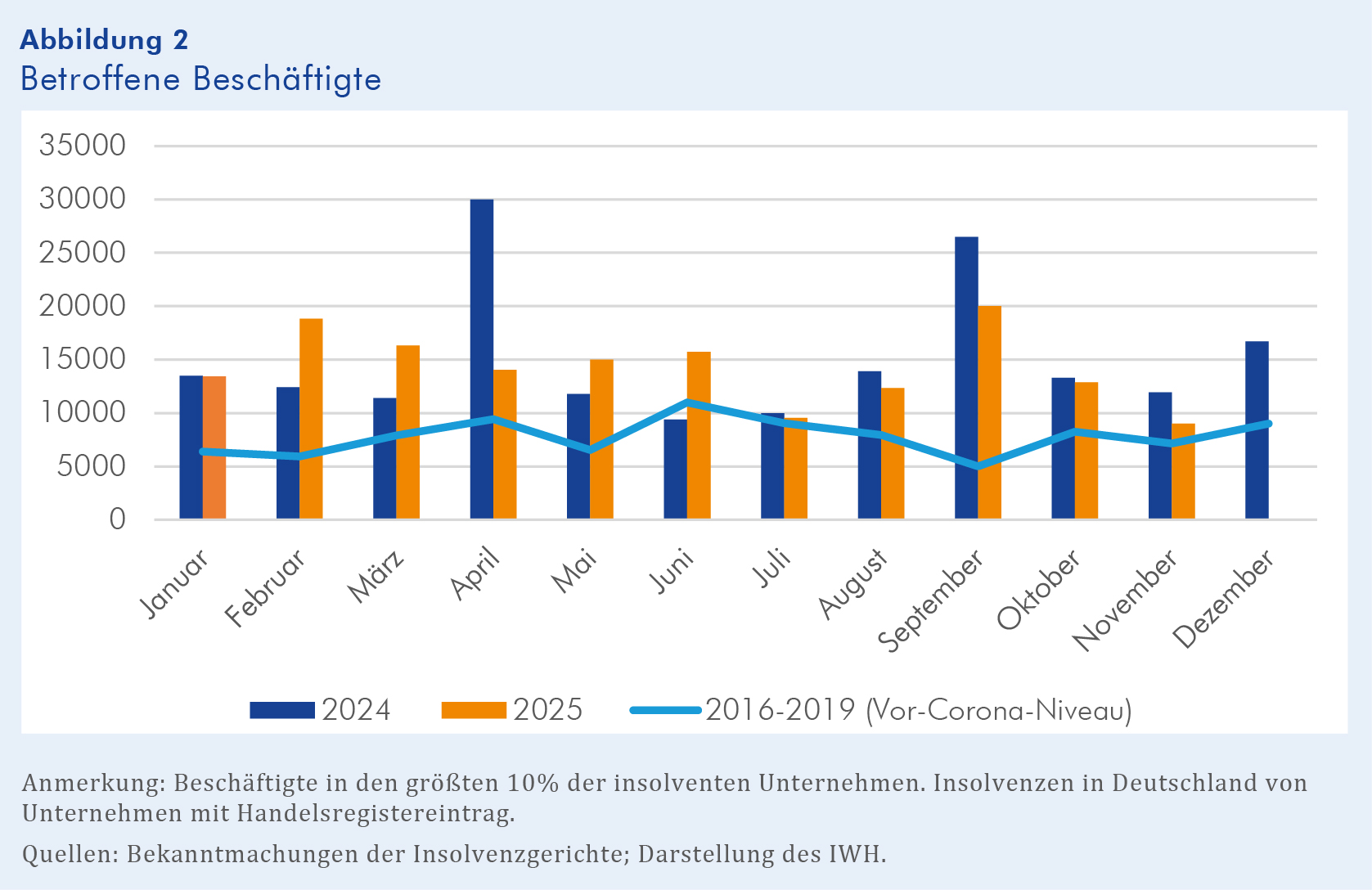 Die im IWH-Insolvenztrend gemeldeten Insolvenzen für Kapital- und Personengesellschaften umfassen in der Regel mehr als 90% der von Unternehmensinsolvenz betroffenen Arbeitsplätze und 95% der Forderungen. Damit bilden diese Zahlen verläss-lich die direkten volkswirtschaftlichen Konsequenzen des Insolvenzgeschehens ab.
