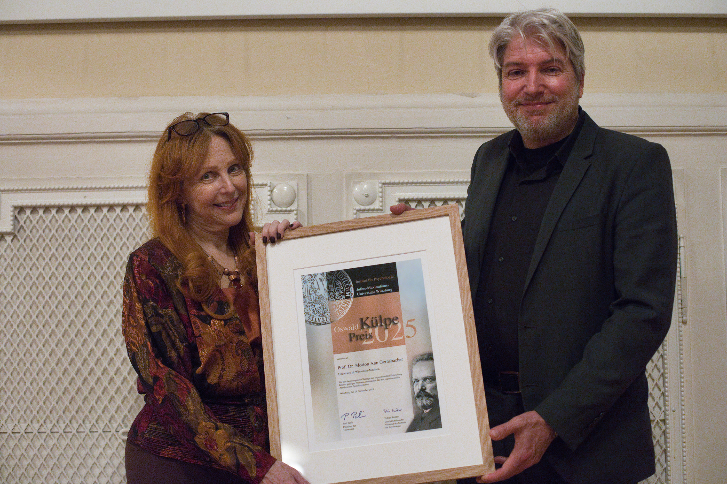 Alle zwei Jahr verleiht das Institut für Psychologie der Julius-Maximilians-Universität Würzburg (JMU) den mit 3.000 Euro dotierten Oswald-Külpe-Preis. Ausgezeichnet werden damit Wissenschaftlerinnen und Wissenschaftler für ihre herausragenden Leistungen in der experimentellen Erforschung höherer mentaler Prozesse. In diesem Jahr geht der Preis an die US-Amerikanerin Morton Ann Gernsbacher. Sie erhielt die Auszeichnung im Rahmen einer Feierstunde am 28. November.