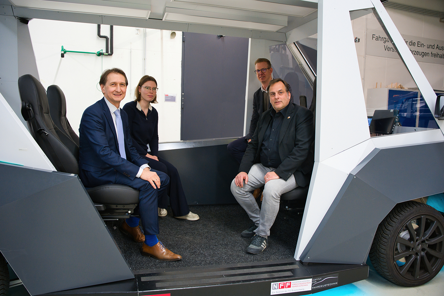Prof. Henze (TU Braunschweig): „Die enge Zusammenarbeit zwischen dem KBA, dem TÜV, dem hiesigen Straßenverkehrsamt und unserem Institut zeigt, dass verantwortungsvolle Innovation nur im engen Schulterschluss gelingen kann. Der heutige Besuch und Besichtigung ist ein wichtiger Meilenstein auf dem Weg zur Weiterentwicklung unseres autonomen Shuttles RAION im öffentlichen Straßenraum“.