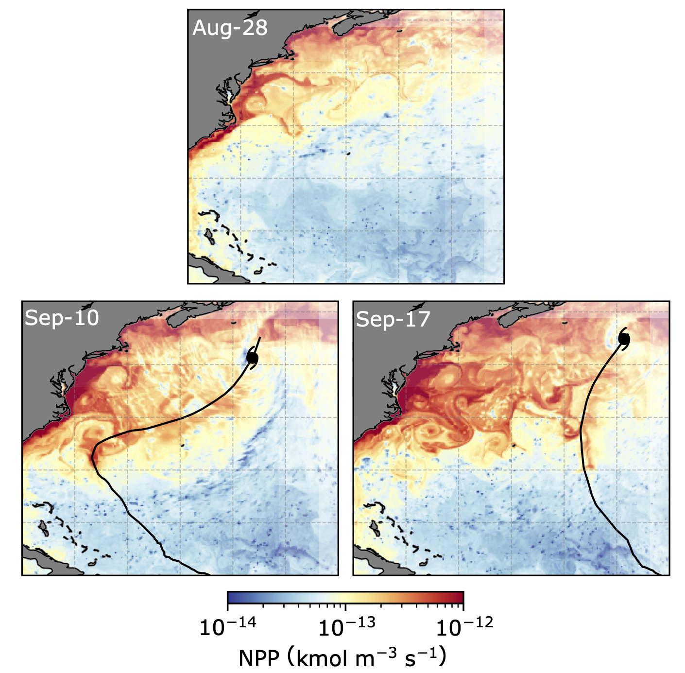Another striking effect of the hurricanes was how they induced mixing in the upper ocean, bringing nutrients to the surface. Phytoplankton growth increased tenfold in response. The bloom lasted for a few weeks after the passage of the hurricanes and was not restricted to their wake: Local currents, partially intensified by the storms, distributed the biomass across large parts of the western North Atlantic. “It was exciting to learn that as a consequence, the hurricanes also increased the amount of organic carbon sinking down in the ocean, contributing to the long-term storage of carbon in deeper ocean layers,” said Tatiana Ilyina, group leader and co-author of the study.