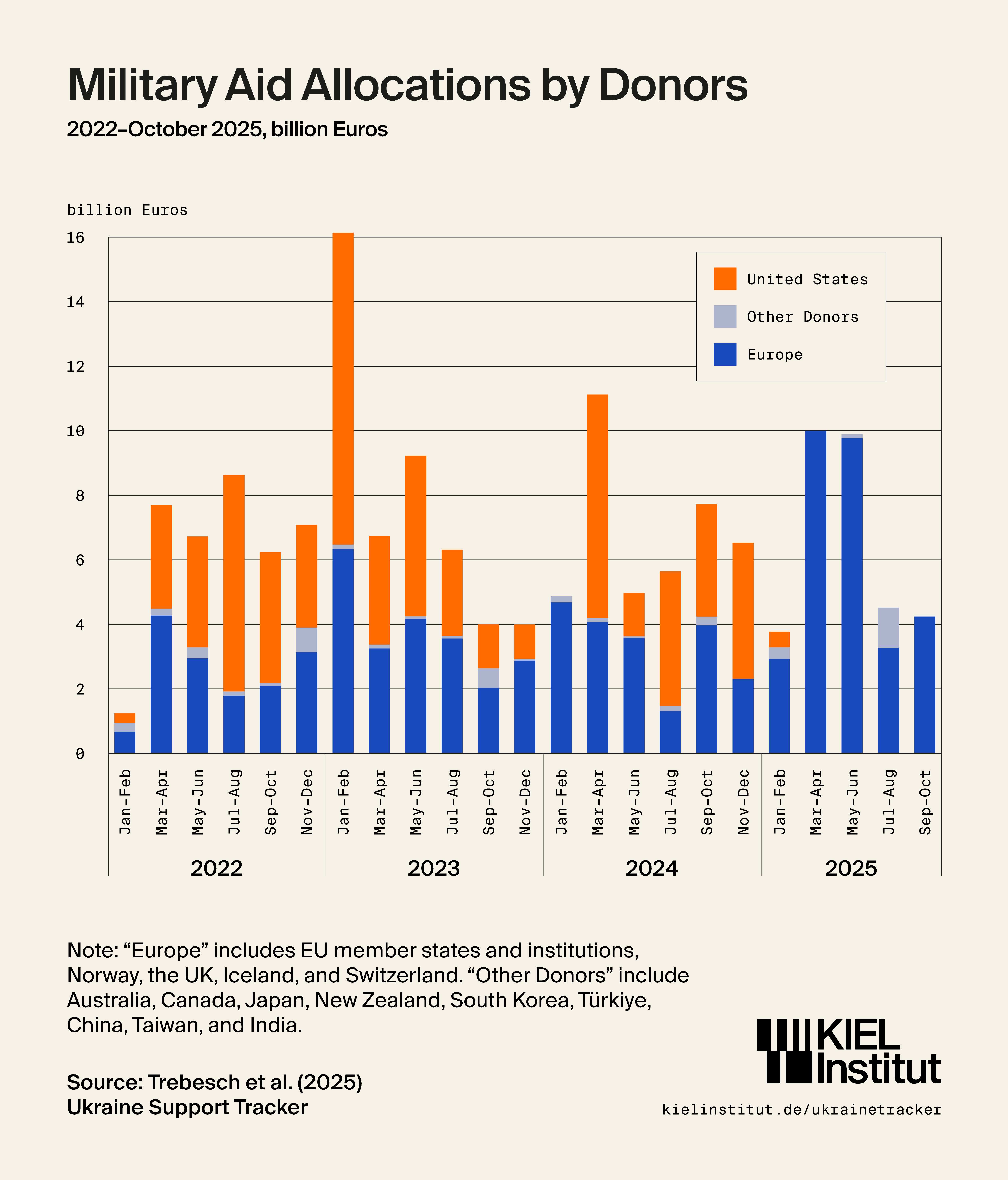 “Based on the data available through October, Europe has not been able to sustain the momentum of the first half of 2025,” says Christoph Trebesch, head of the Ukraine Support Tracker (https://www.kielinstitut.de/experts/christoph-trebesch/). “The recent slowdown makes it difficult for Europe to fully offset the absence of US military aid in 2025. If this slower pace continues in the remaining months, 2025 will become the year with the lowest level of new aid allocations ever for Ukraine since the outbreak of the full-scale invasion in 2022.”