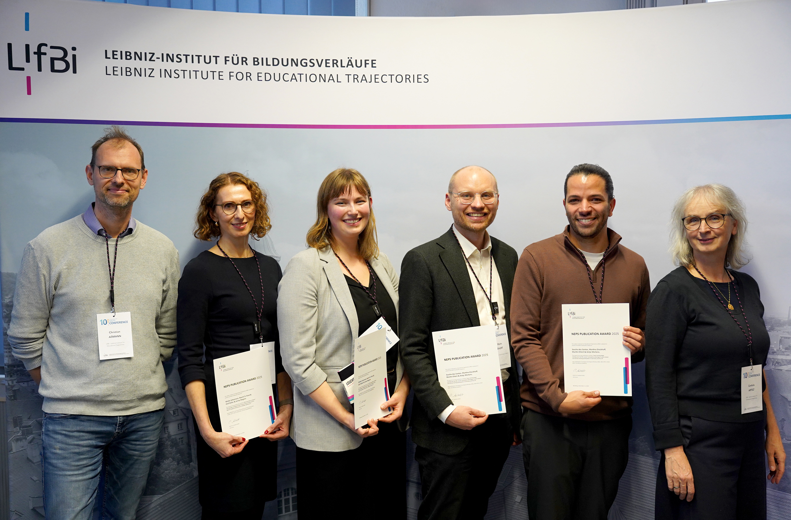 Das LIfBi würdigt jährlich herausragende wissenschaftliche Arbeiten auf Basis der Daten des Nationalen Bildungspanels mit einem Publikationspreis. Dieses Jahr wurde dieser aufgrund der zahlreichen hochwertigen Einreichungen zweifach vergeben. Zum einen erhielten Sascha dos Santos, Prof. Dr. Martina Dieckhoff, Prof. Dr. Martin Ehlert und Prof. Dr. Antje Mertens den Preis für ihre Vergleichsarbeit zu Vorteilen berufsbezogener Weiterbildung in Deutschland und UK. Zum anderen wurden Mieke Johannsen, Prof. Dr. Naemi Brandt, Prof. Dr. Olaf Köller und Prof. Dr. Jenny Wagner für ihre Publikation zur Rolle von akademischem Selbstkonzept und Persönlichkeit für die Schulleistungen ausgezeichnet.