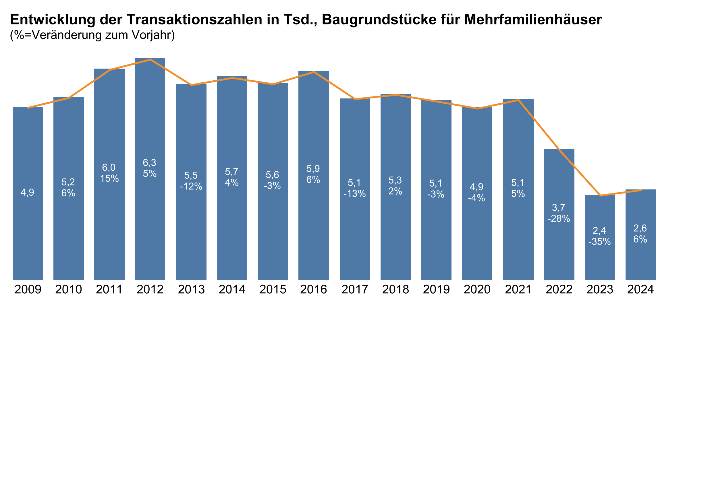Auch bei Wirtschaftsimmobilien setzte sich der langfristige Abwärtstrend fort. Die Zahl der Transaktionen sank binnen zehn Jahren von 85.300 auf 58.100 (–32 Prozent). Beim Geldumsatz betrug der Rückgang 26 Prozent. Bei Baugrundstücken für Gewerbeimmobilien fiel der Geldumsatz um mehr als ein Drittel – von 4,5 Milliarden Euro im Jahr 2014 auf 2,9 Milliarden Euro 2024.