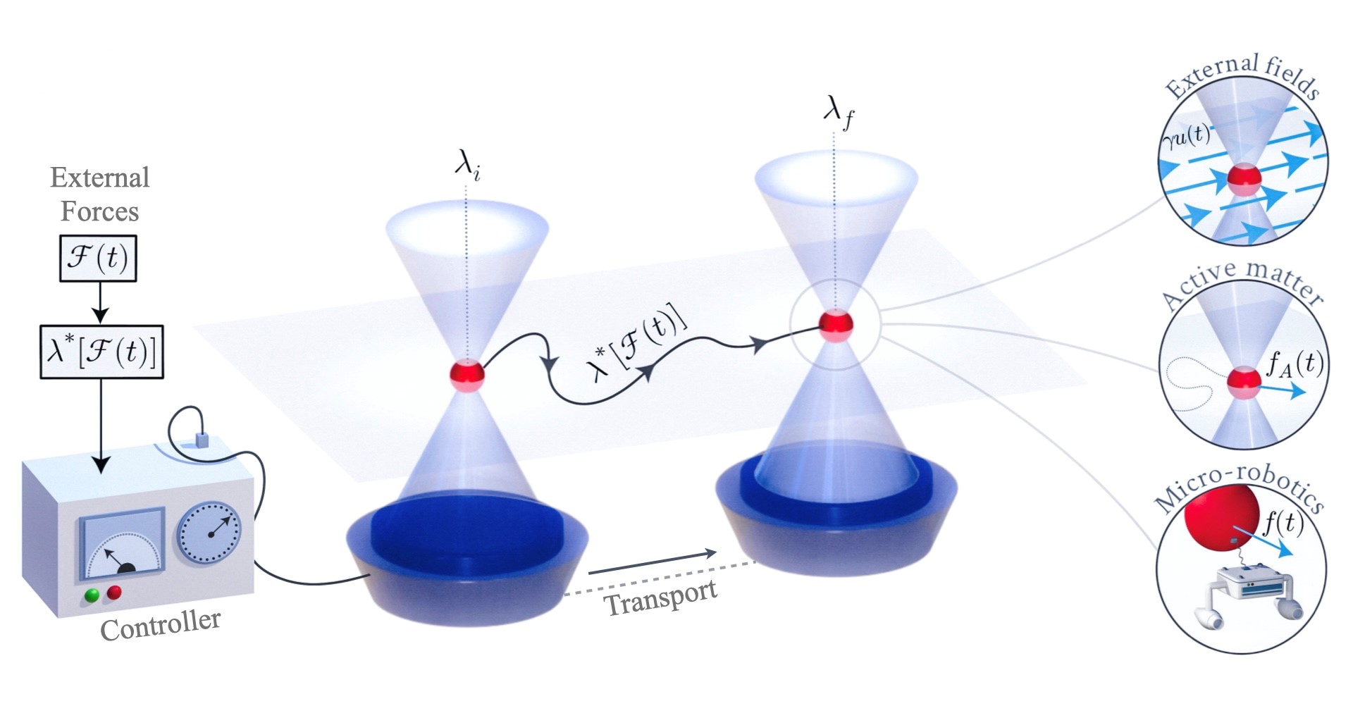 A particle (red sphere) is guided from left to its destination (right) using a laser trap (double-cone) by means of a protocol developed in the study, which is described by the parameter λ. A known time-dependent external force field F (t) acts on this environment. The optimised protocol exploits this force field in a way that extracts the maximum amount of work. This can be applied to various external fields, to active particles and to micro-robot transport problems. (Fig.: HHU/Kristian S. Olsen)