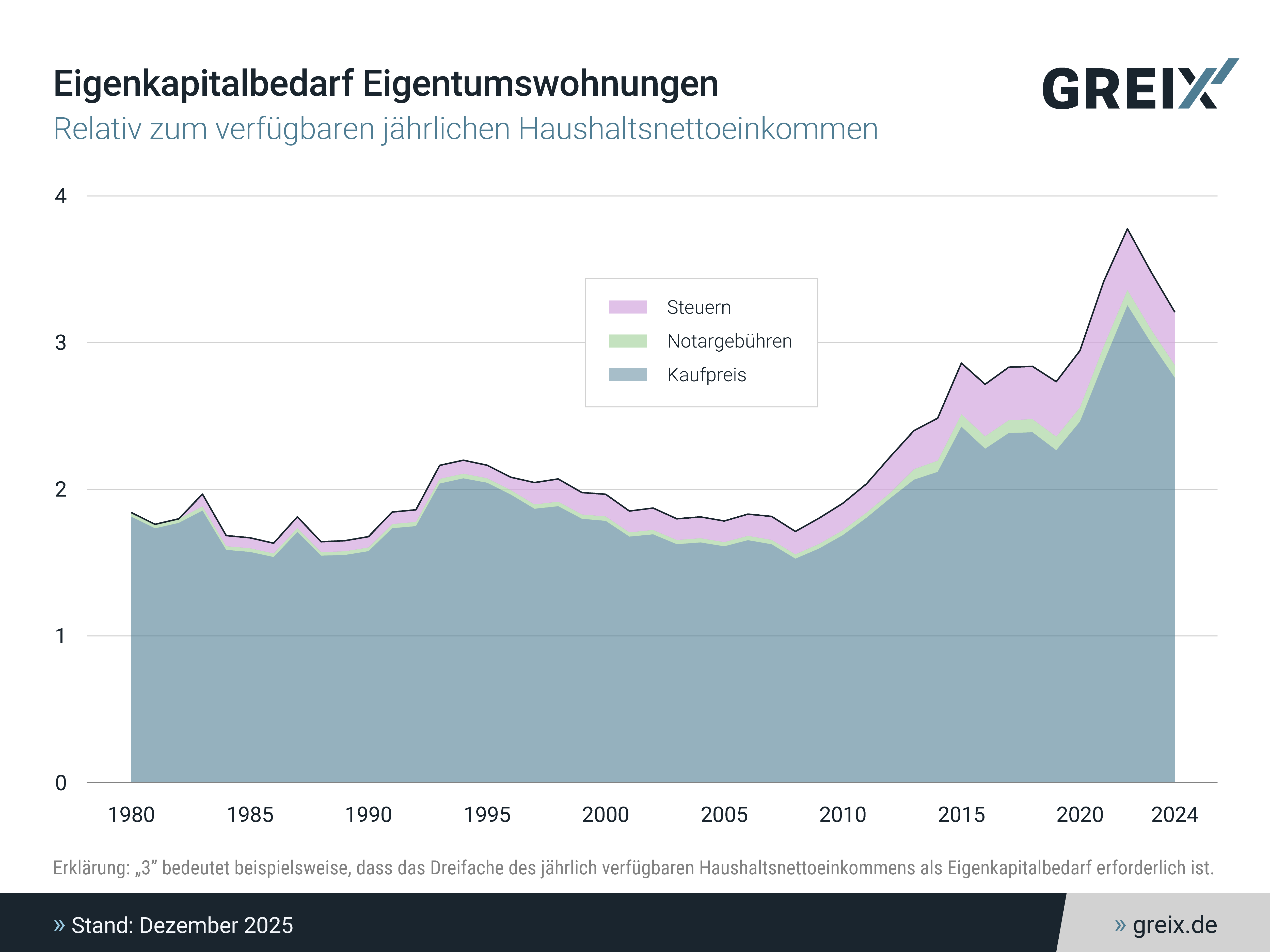 Demnach ist der Immobilienkauf heute durch eine deutlich gestiegene Eigenkapitalquote sehr viel schwerer geworden. In den 1980er-Jahren reichte für die Finanzierung einer Eigentumswohnung im Schnitt etwa das 1,7-Fache des Jahreshaushaltseinkommens, heute sind mehr als 3 Jahresgehälter nötig.