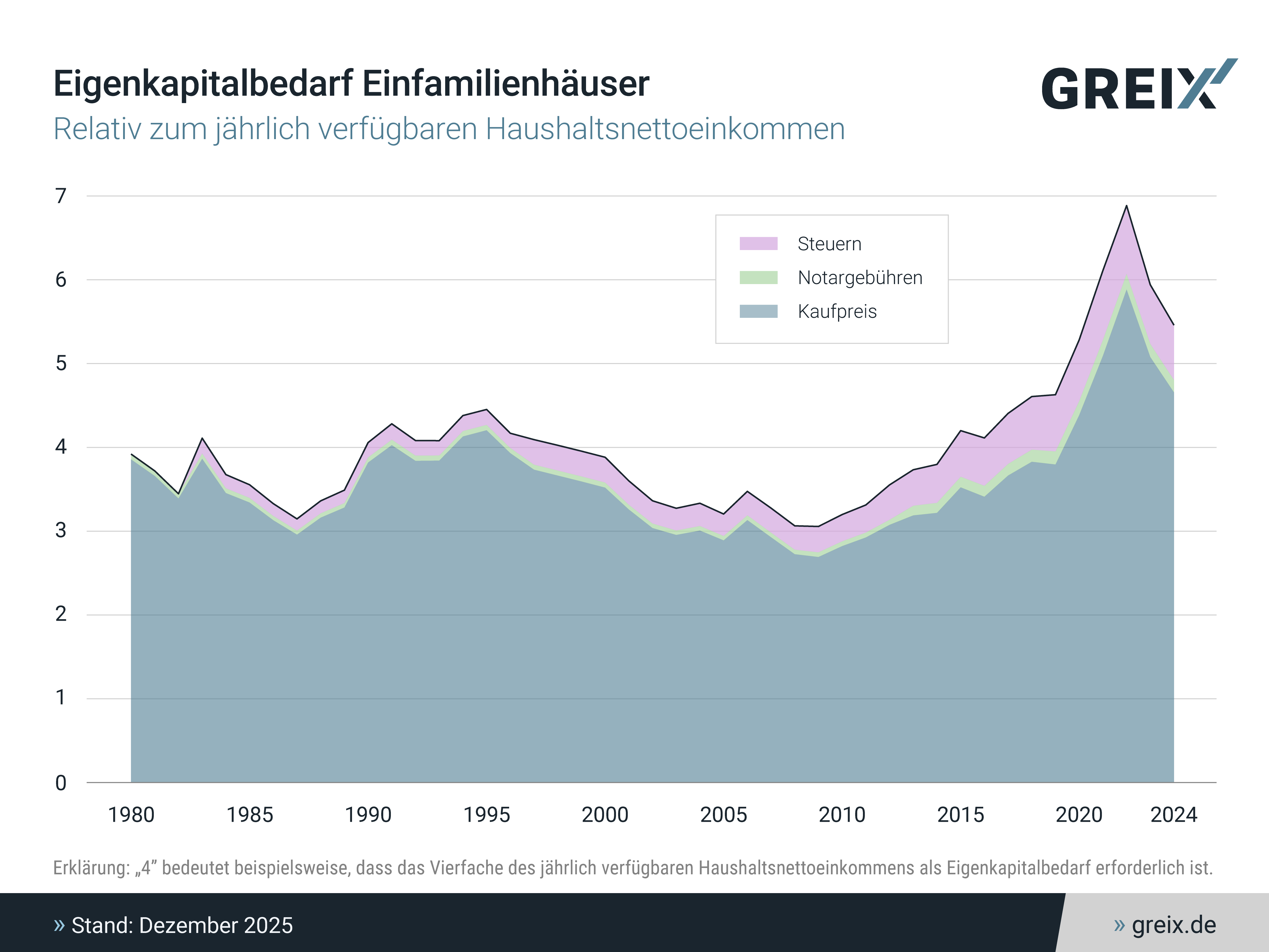 Bei Einfamilienhäusern war in der Hochphase des Immobilienbooms sogar das 7-Fache des Jahreshaushaltseinkommens als Eigenkapital für eine Finanzierung nötig, aktuell liegt der Wert bei mehr als dem 5-Fachen. In den 1980er-Jahren reichte im Schnitt das 3,6-Fache Jahreshaushaltseinkommen als Eigenkapital für einen Kredit.