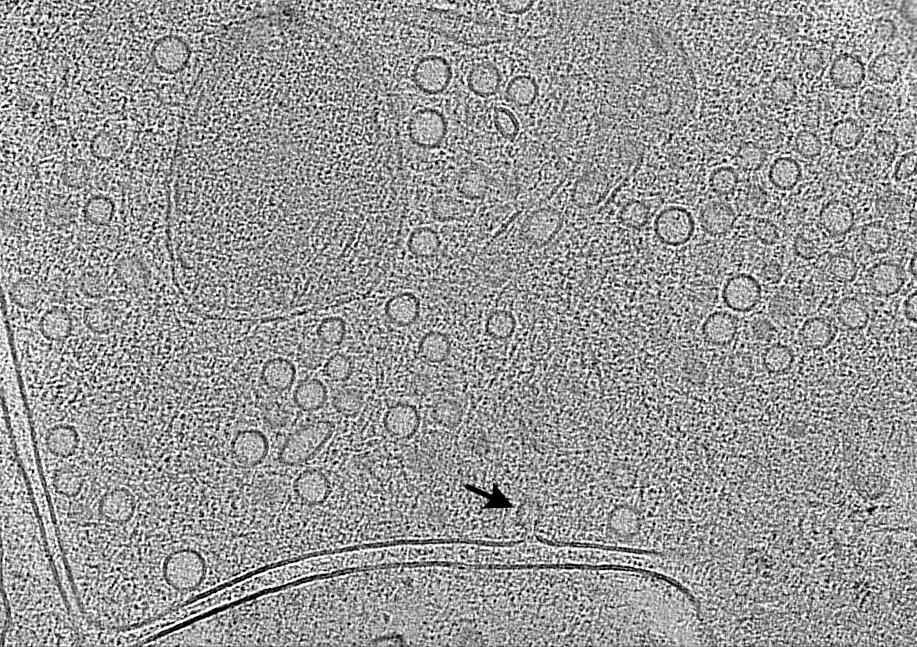 3 - Das Bild zeigt den ultrakurzen Moment, in dem ein Vesikel (Pfeil) mit der Zellmembran fusioniert. Durch die Überlagerung mehrerer elektronenmikroskopischer Bilder – die Elektronentomographie – wird sichtbar, wie viele Vesikel am Ende einer Nervenzelle darauf warten, ihre Botenstoffe in den synaptischen Spalt abzugeben. Dieser Zwischenraum zwischen zwei Nervenzellen ist in der Aufnahme als doppelte Linie zu erkennen. © Charité/Max Delbrück Center | Jana Kroll