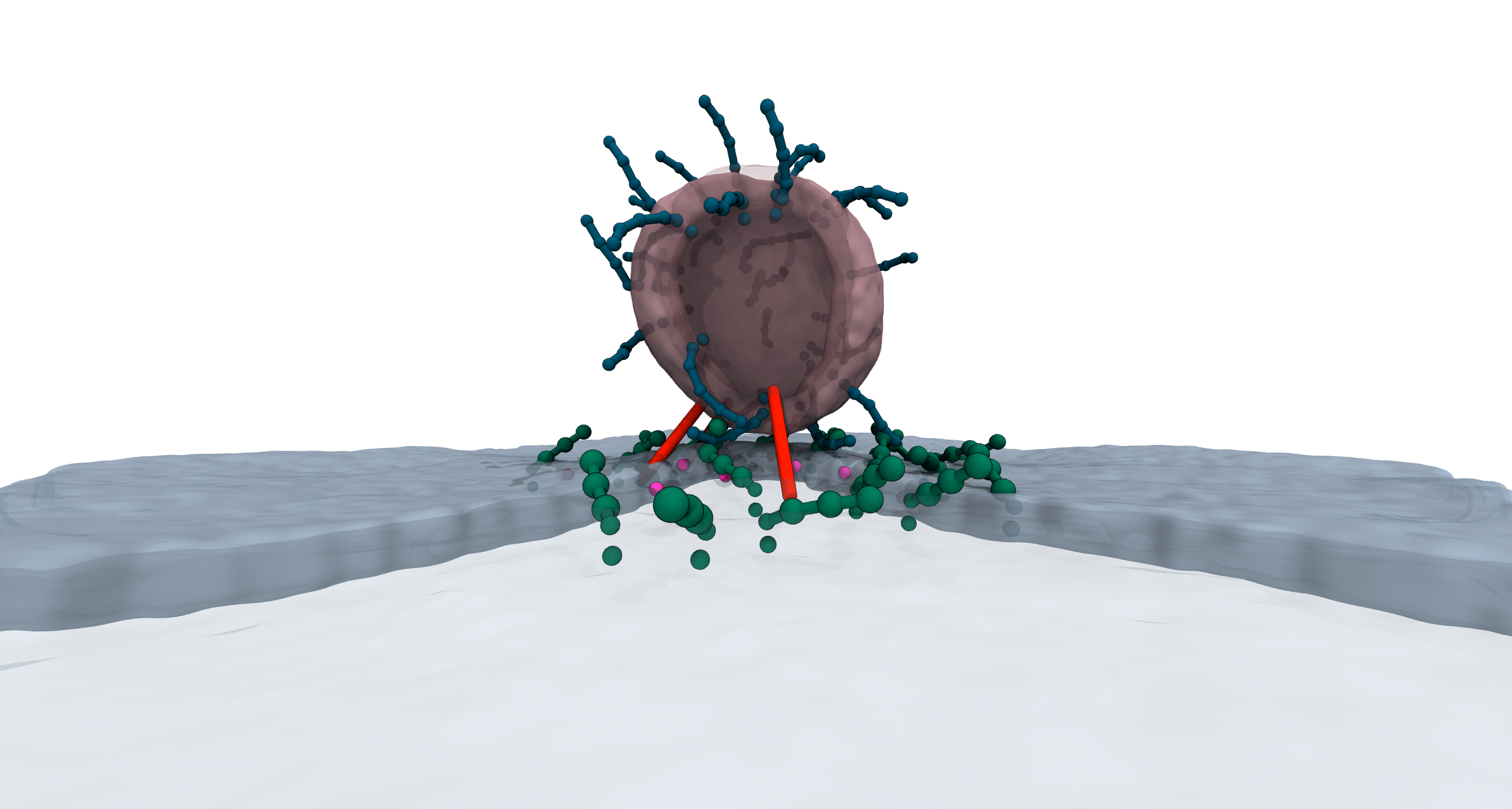 2 - So nähert sich ein Neurotransmitter-gefülltes Vesikel der Zellmembran (Simulation): Per rotem „Protein-Ärmchen“ nimmt das etwa 40 Nanometer große Bläschen Kontakt mit der Oberfläche der Nervenzelle auf und zieht sich näher heran. Sobald es nah genug ist, greifen die grünen Ärmchen des Vesikels nach den grünen Ärmchen der Membran und initiieren den eigentlichen Fusionsprozess. Es entsteht zunächst eine punktförmige Verbindung, die sich zu einer Pore erweitert. Durch sie entlässt das Bläschen die Neurotransmitter in den synaptischen Spalt, die nachfolgende Nervenzelle wird aktiviert. © Mohsen Sadeghi