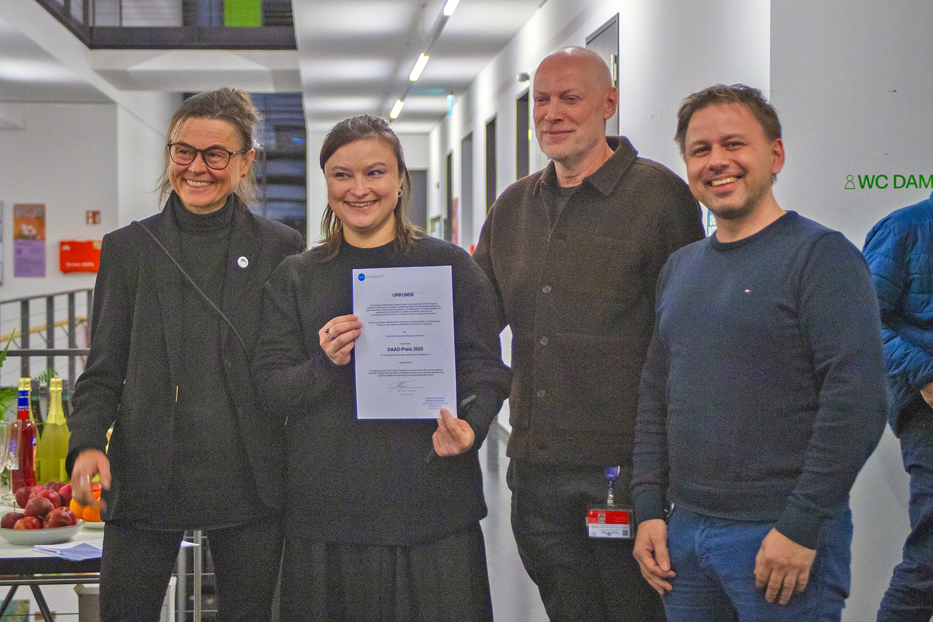 Der DAAD-Preis ist mit 1.000 Euro dotiert und wird jährlich vom DAAD an internationale Studierende deutscher Hochschulen für hervorragende Leistungen und interkulturelle Aktivitäten verliehen. Die offizielle Preisverleihung fand dieses Jahr im Rahmen der Ausstellungseröffnung der Plakate für die „Umsonst&Draußen“-Konzertreihe an der Fakultät Gestaltung statt.