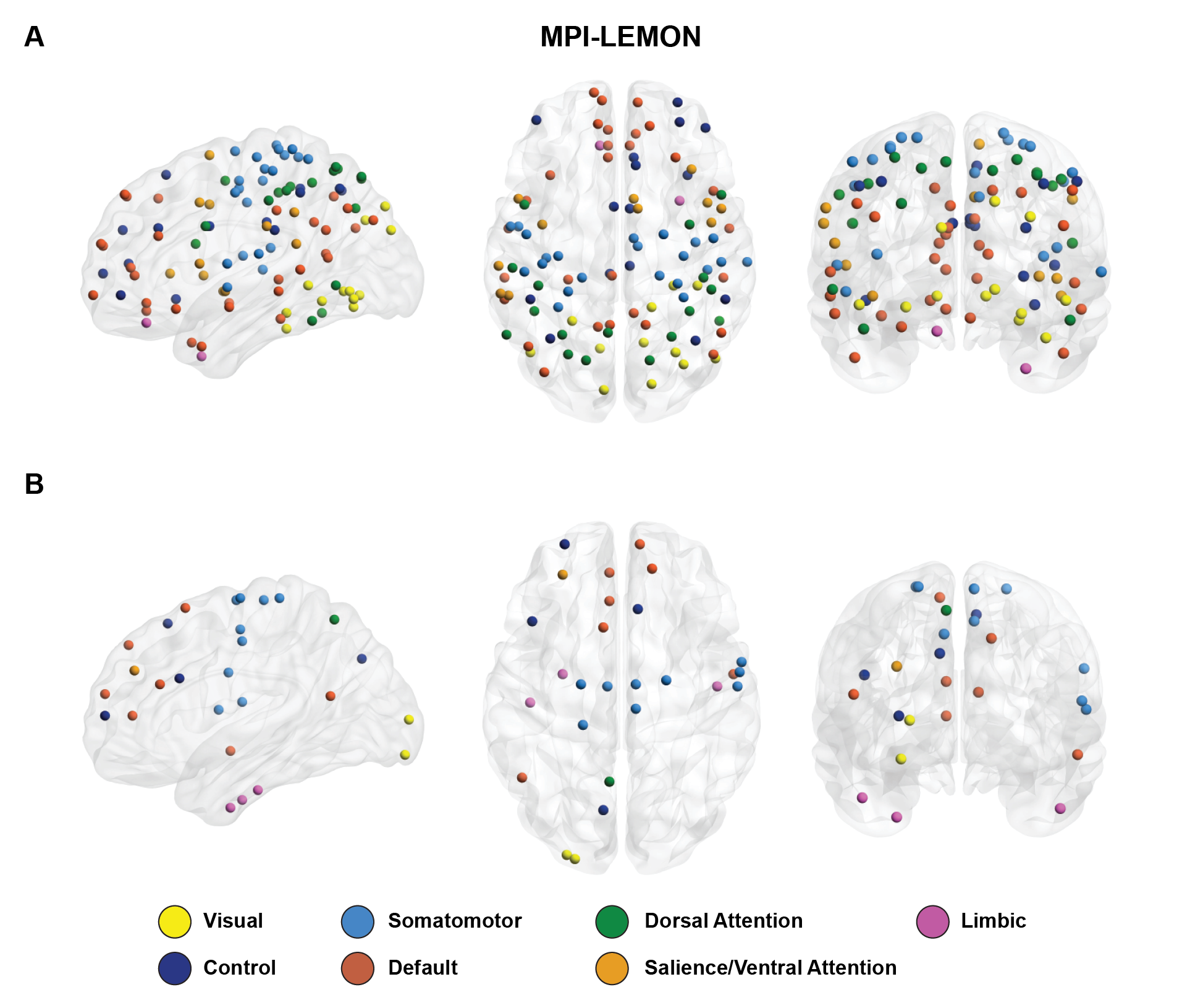 (A) MPI-LEMON dataset: 108 regions with significant differences (p < 0.05, FDR corrected) in node persistence between the healthy young and healthy elderly groups. For every region, young individuals show higher node persistence compared to the elderly individuals, except for one region in the limbic network (RH_Limbic_TempPole_1).