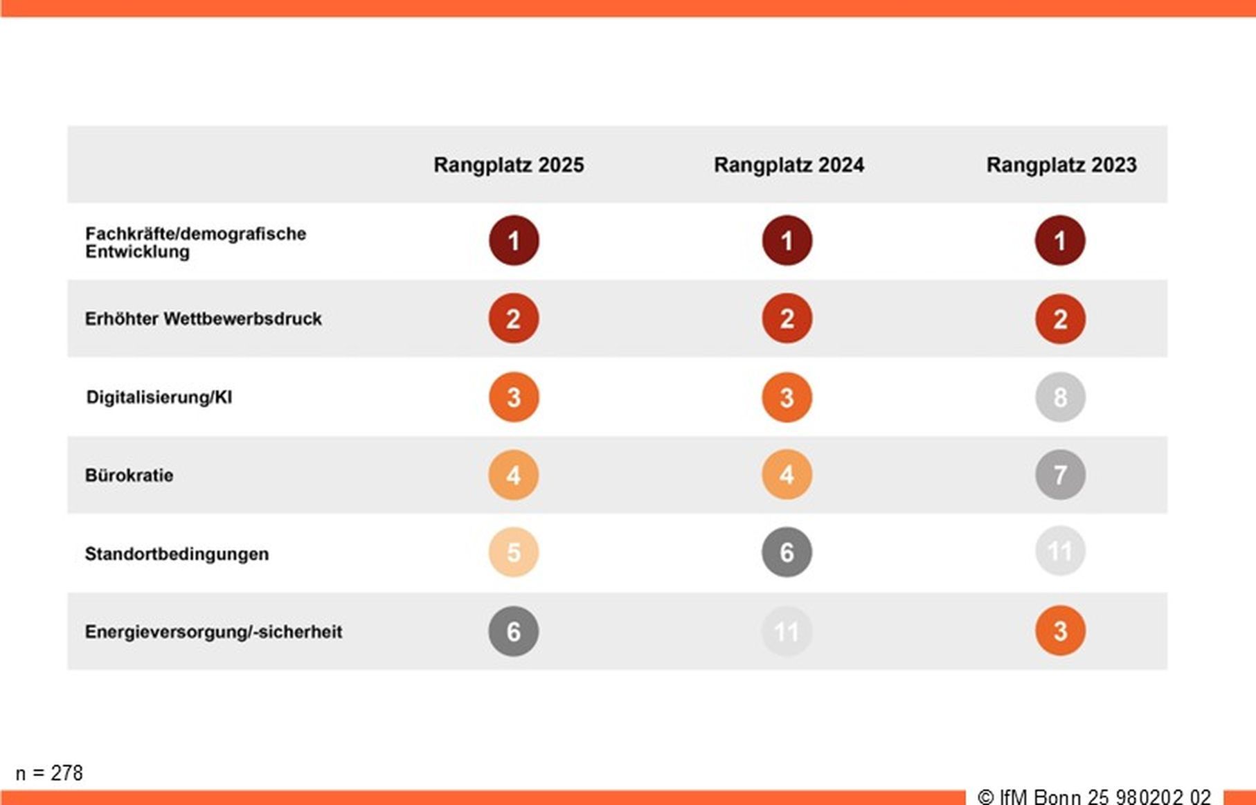 Neben den Themen "Fachkräfte/demografische Entwicklung", "Erhöhter Wettbewerbsdruck", "Digitalisierung/KI" und "Bürokratie", die seit drei Jahren an der Spitze der Herausforderungen stehen, sorgen sich die Unternehmerinnen und Unternehmer insbesondere im Produzierenden Gewerbe um die Standortbedingungen in Deutschland.
