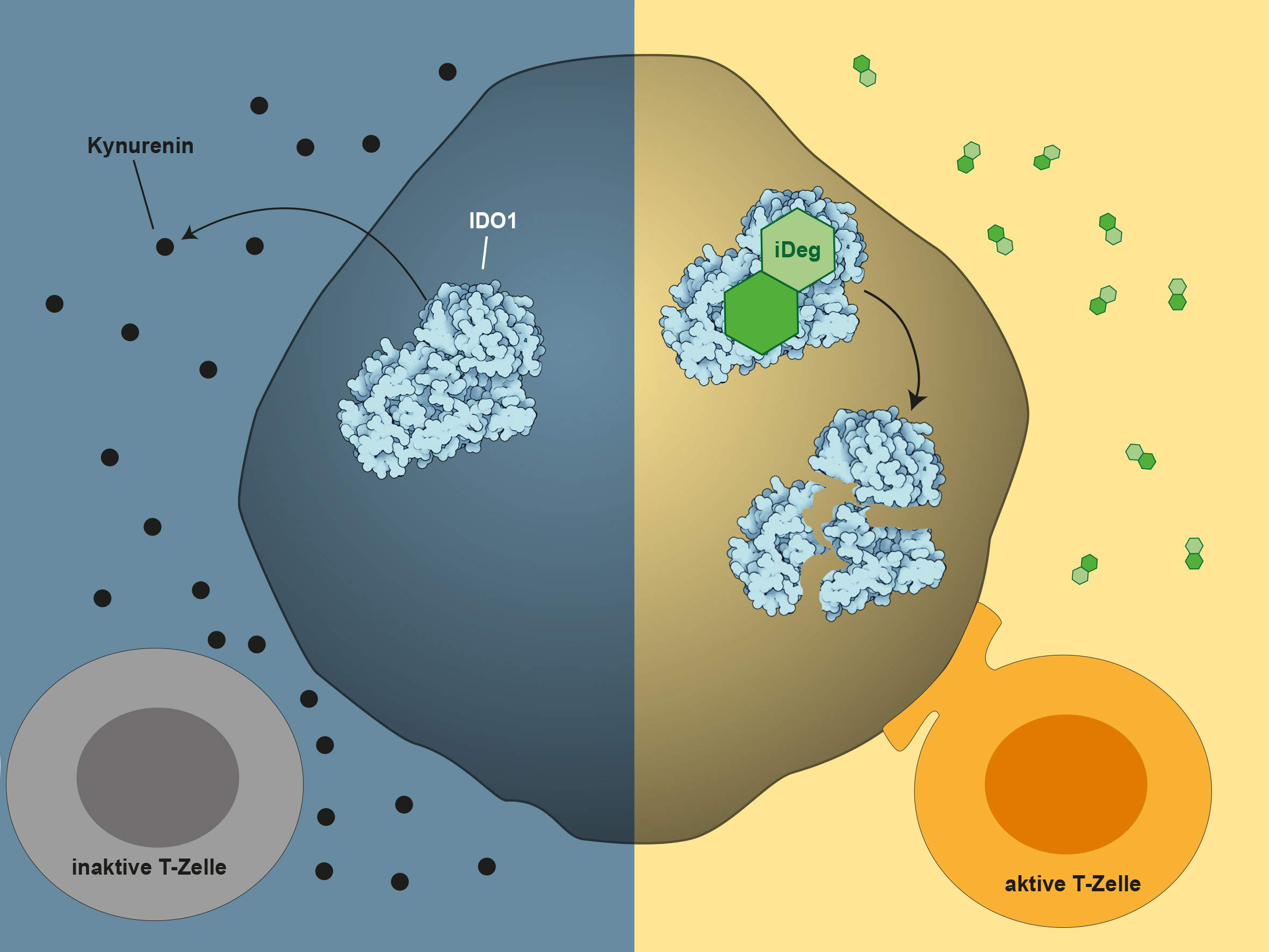Immuntherapien mit Checkpoint-Hemmern lösen gezielt die krebsschützenden „Bremsen“ im Immunsystem und werden bereits zur Behandlung vieler Tumorarten wie dem schwarzen Hautkrebs, Lungen-, Darm- und Brustkrebs eingesetzt. Leider wirken diese Immuntherapien nur bei einem Teil der Betroffenen und nicht selten entwickeln sich auch Resistenzen. Präklinische Studien haben gezeigt, dass sich die Wirkung von Checkpoint-Hemmern deutlich verbessert, wenn man sie zusammen mit Hemmern des immunmodulierenden Enzyms Indolamin-2,3-Dioxygenase (IDO1) einsetzt. Während IDO1 im normalen Gewebe kaum vorkommt, liegt es im Tumor in hohen Mengen vor. Dort verstoffwechselt es die Aminosäure Tryptophan in Kynurenin, was zahlreiche negative Effekte auf die Immunantwort hat, wie z. B. die Reduktion der Menge und Aktivität der T-Killerzellen.